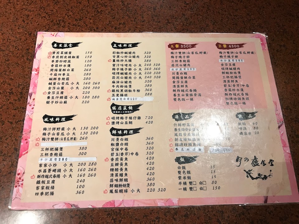 月之盧的招牌是炭烤梅子桶仔雞(味道口感普通價格不便宜)、鹽烤山泉鯛,最好吃的是梅汁拌野蕨; 裝潢融合現代、客家、原住民的調調; 廁所必須走出室外, 完全沒裝潢, 在廁所內找不到衛生紙,必需找到廁所外才有,水龍頭還壞掉一個是敗筆
