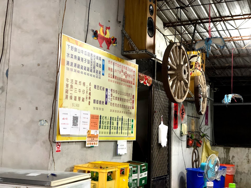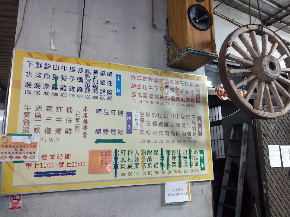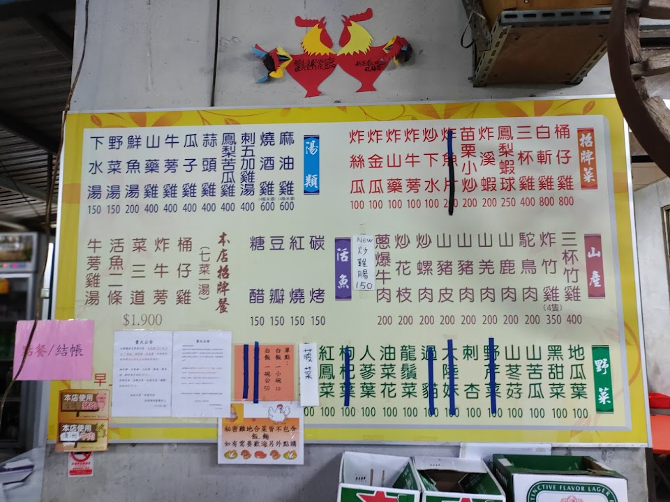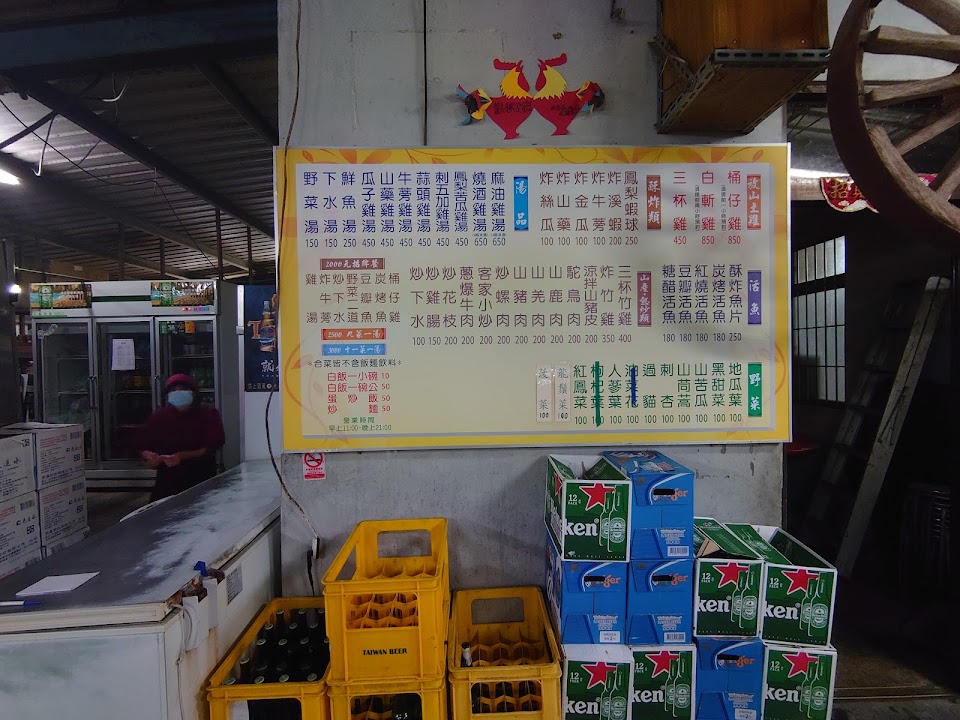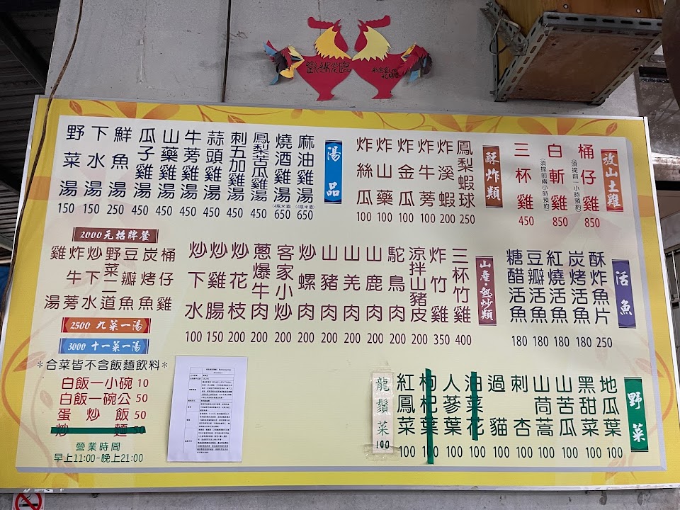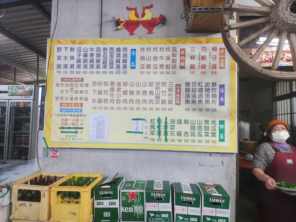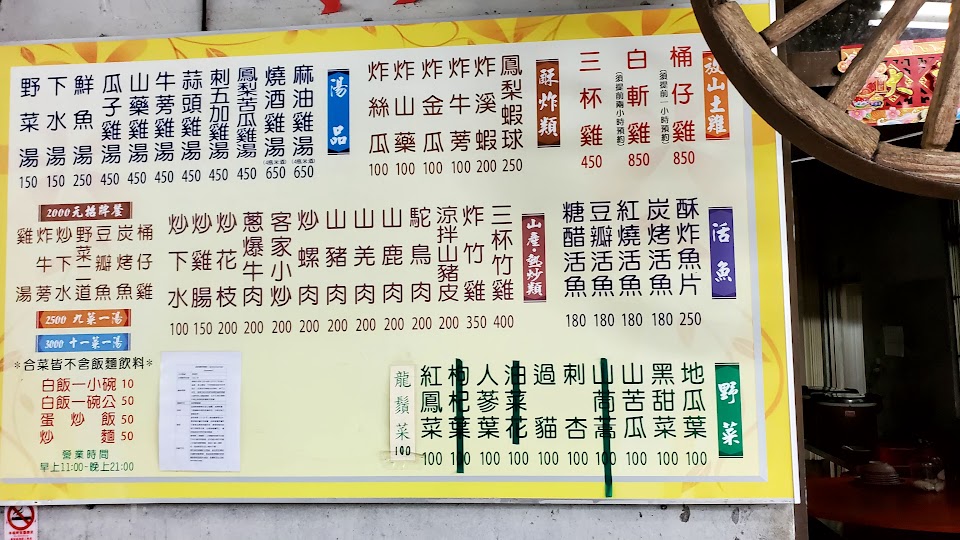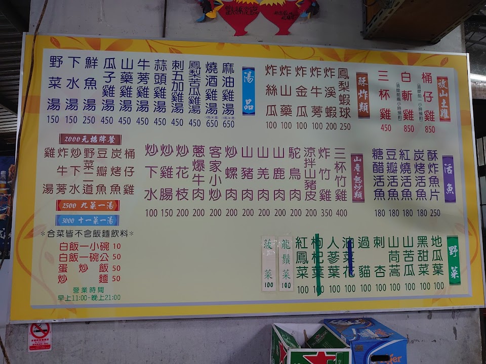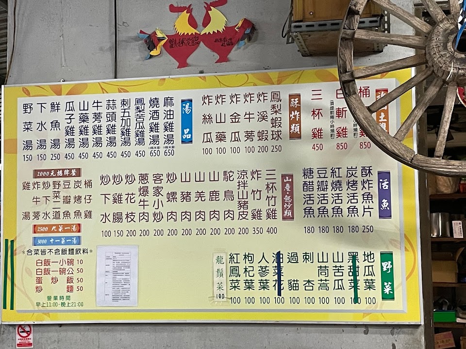 桶仔雞 炸牛蒡 山蘇 地瓜葉 糖醋魚 烤雞 野菜湯 山豬皮 炒枸杞葉 客家小炒