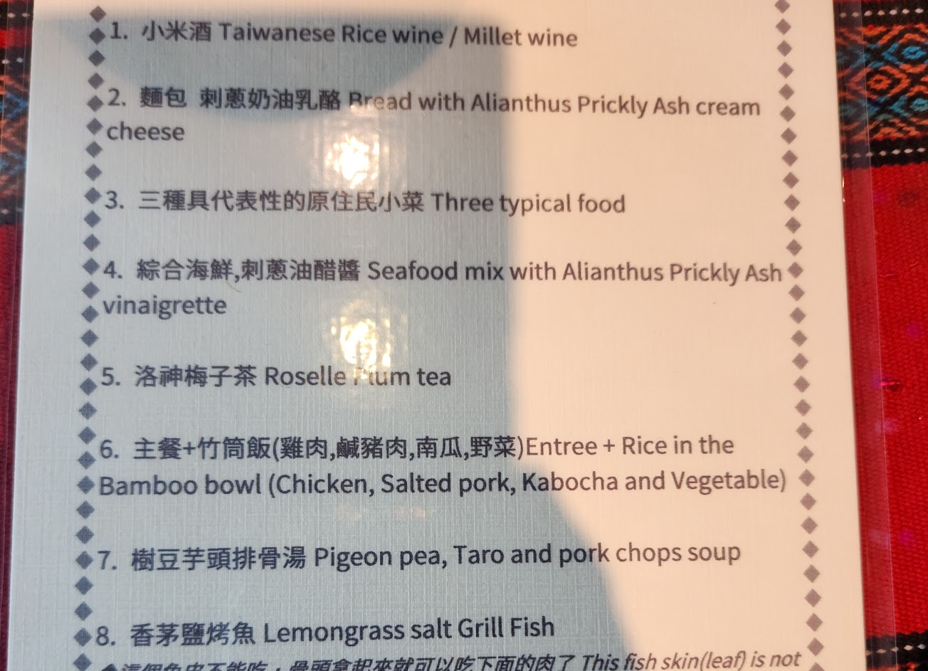 本身很喜愛香茅跟馬告的香味,傳統道地料理這二種香味不可少,小米酒跟印象中不一樣酸酸甜甜,像鮮橙汁又不像跟料理一樣很難捉摸,乳酪繼光餅比西式奶油餐包好吃太多了?鳳梨香茅很順口,蠻喜歡海菜類的脆脆口感,竹筒飯可以用小一點竹筒片代替湯匙挖食?豐年喻豐盛。