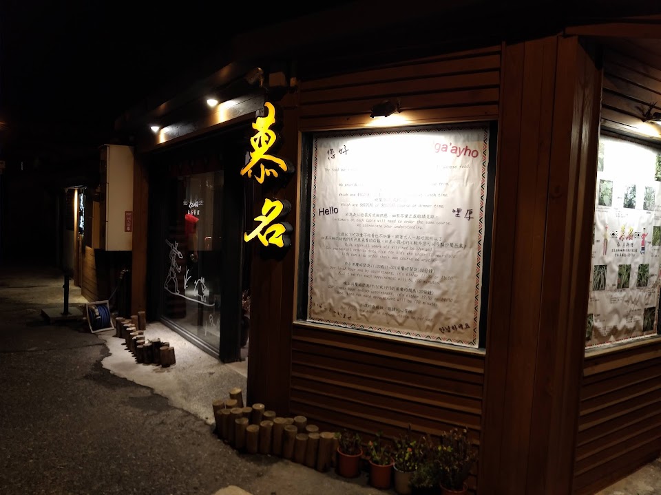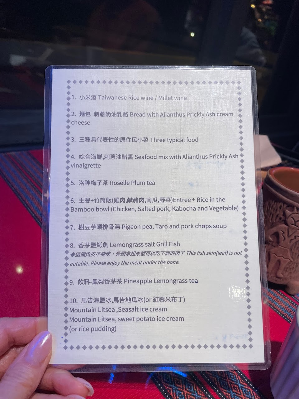 很普通卻很貴的名店。無菜單料理只是標準套餐的代名詞,基本上就那幾道,沒什麼選擇。服務生上菜時不會介紹,菜名也說得很含糊。小米酒調酒好喝也有特色,但只有很小一杯。前菜擺盤好看,生魚片是全旗魚,主餐吃起來非常油膩,配菜是莧菜。烤魚很大一隻,是吳郭魚,吃起來是土味與刺蔥的蚊香味,很看個人喜好。南瓜蔬菜湯的南瓜味很淡,竹筒飯的飯香氣不足。冰淇淋還不錯,口味有特色,但不會想再吃。