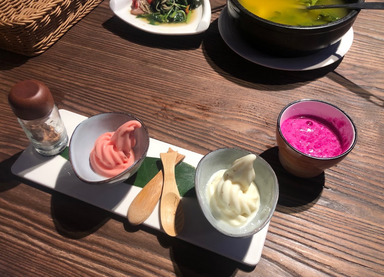 這間是原住民餐廳 沒有menu 只有一人550or650的套餐選擇 我們選的是650一位的 吃完這麽多 感覺真的是很有飽腹感 米酒很好喝 香茅海鹽烤魚很好吃 最後的馬告海鹽冰激淩也都被我一個人獨吞了真的是很不錯哦