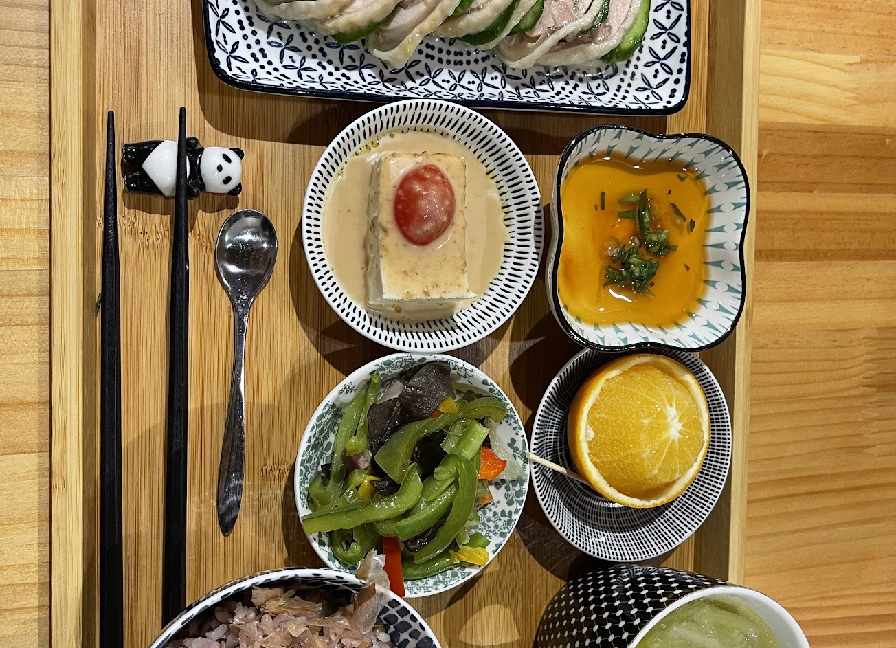 餐點只有醉雞、梅花豬排、鬼頭刀魚三種定食選擇(不定期有牛),價格都是280元~這次嘗試了魚和雞,健康清淡很喜歡!!搭配的小菜有溫泉蛋、龍蝦菜、胡麻豆腐(超級優秀?扎實綿綿的口感)、水果小碟和魚丸湯。