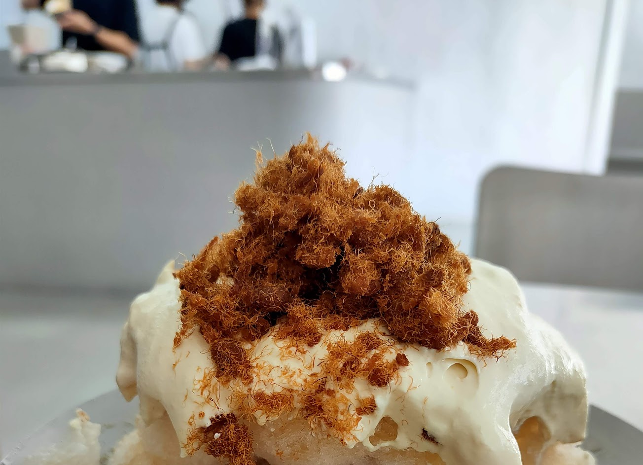 ?鹹蛋黃芋頭冰: 刨冰有淋糖水,裡頭是綿密的芋泥 中間是鹹蛋黃奶油,神來之筆是最上面的肉鬆 鹹甜鹹甜,好吃且有層次又不會膩 比預期的還更好吃