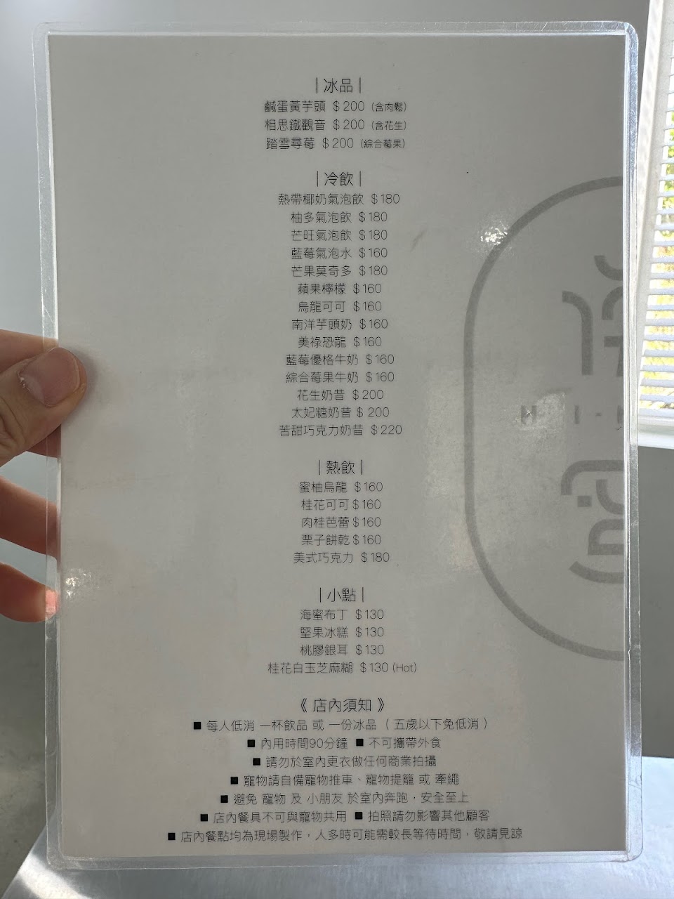 每人低消一杯飲品或冰品,建議大家分著吃,一個人吃一份有點多。 冰品多元,有很多選擇,比較推薦清爽的芒果口味以及莓果優格。芒果口味吃得到芒果果肉,淋醬的味道也很濃郁;莓果優格的奶蓋是優格口味,帶酸味,有驚喜的感覺,與一般想的奶蓋不同,莓果醬熬的很香甜。 鐵觀音的奶蓋比較甜,容易感到膩口。杏仁奶蓋味道過於突出,喜歡杏仁可以嘗試,但感覺整體不夠和諧。 空間舒適,廁所也很乾淨,環境分數很高!