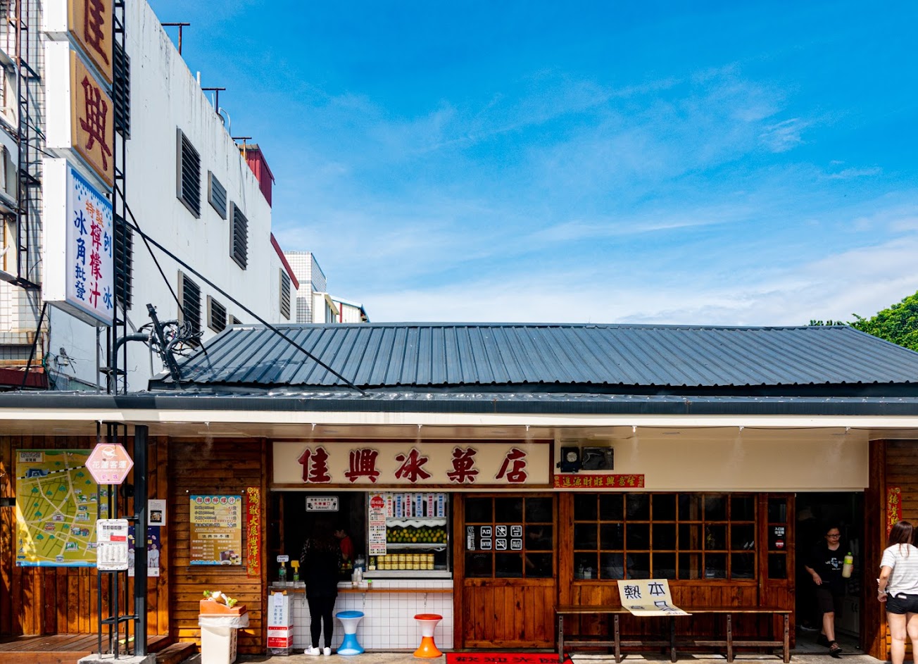 「佳興冰果室」店門外觀感覺有重新反修整理過,帶點簡易日式傳統設計,可愛的貓咪喝檸檬汁手繪圖,帶點文青風格!!遇到用餐時間,人潮蜂擁而至,車要停遠一點才有位置。