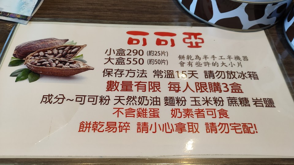 可可亞口味不會太甜,下午茶配茶或咖啡還不錯,單吃會太乾一定要配喝的,價錢跟其他家相比價錢偏高許多,吃過就好會有更好的選擇