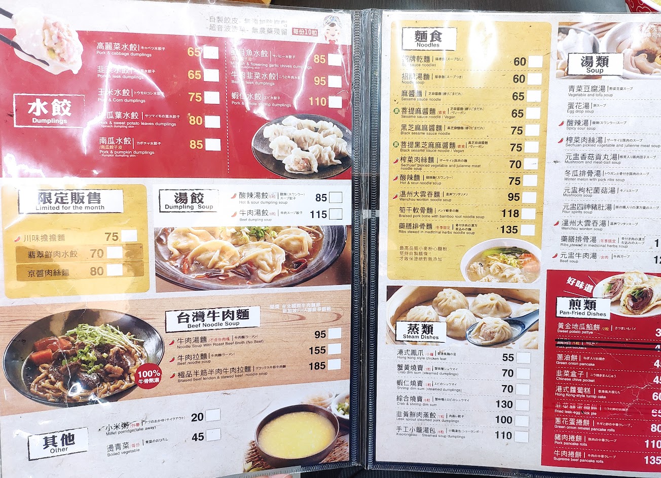 鍋貼成品稍嫌粗糙(時見皮開肉綻),水餃時而破皮…服務普通。