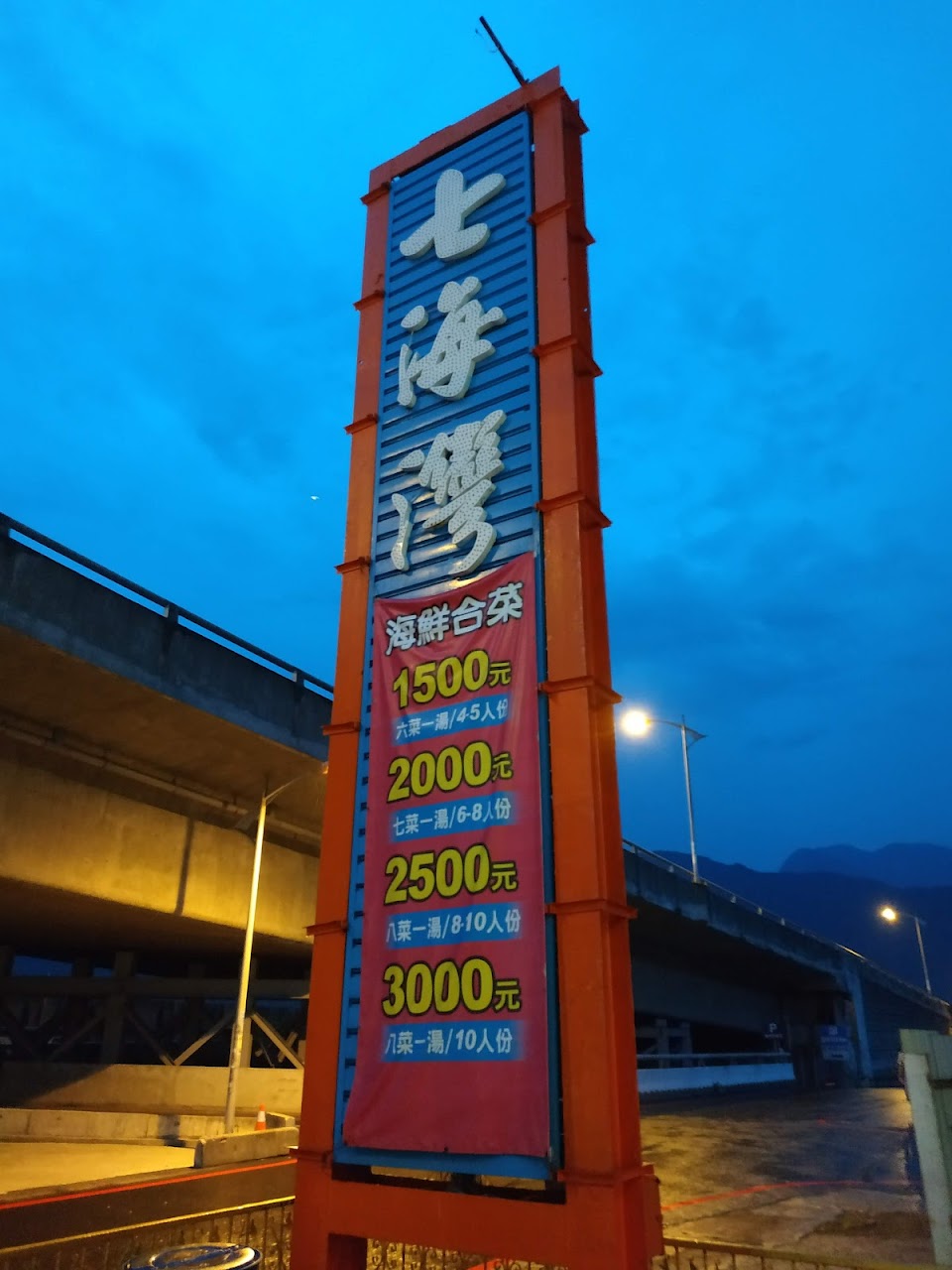 我們是突然出現的小桌客人,從「海灣美食鍋」的聯絡電話被引導到「七海灣餐廳」。吃完後有種被詐騙的感覺!相較於旁邊三大桌的團客,我們似乎是天上掉下來的禮物,服務人員不太在乎我們的需求。我們點五人2000元套餐,餐點各種普通,生魚片與涼拌龍鬚菜都還是冰塊的狀態,打算讓我們自己退冰吧我想!飯後送上的水果西瓜軟爛不新鮮,還明險有撞到髒東西的痕跡。經營餐廳沒了熱情,那跟鹹魚有什麼兩樣!