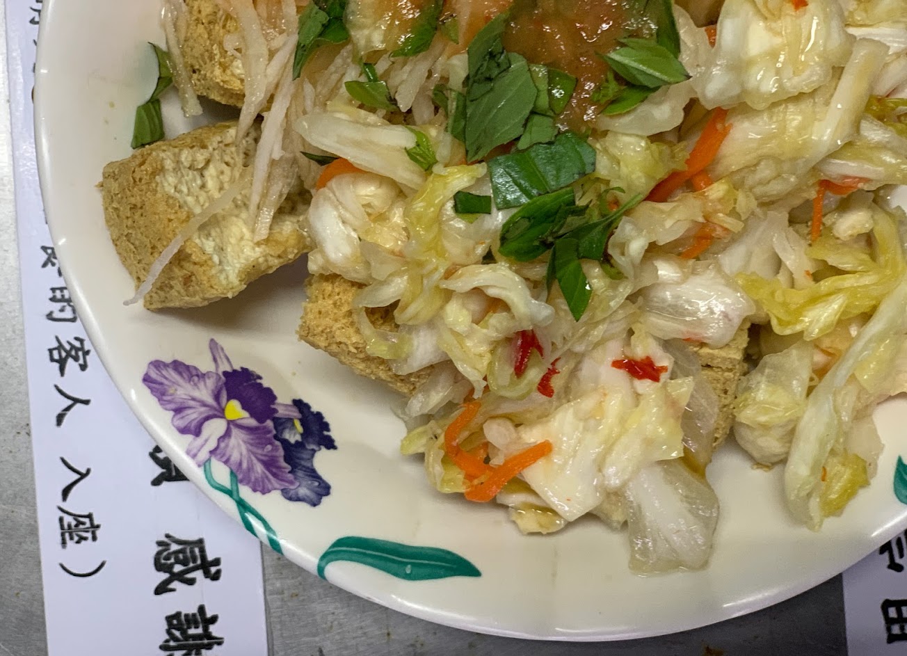 豆腐上放置九層塔 泡菜 與白蘿蔔絲 蠻特殊的配置 個人不愛生白蘿蔔絲 但光吃泡菜配上些許的九層塔就可以得到滿了