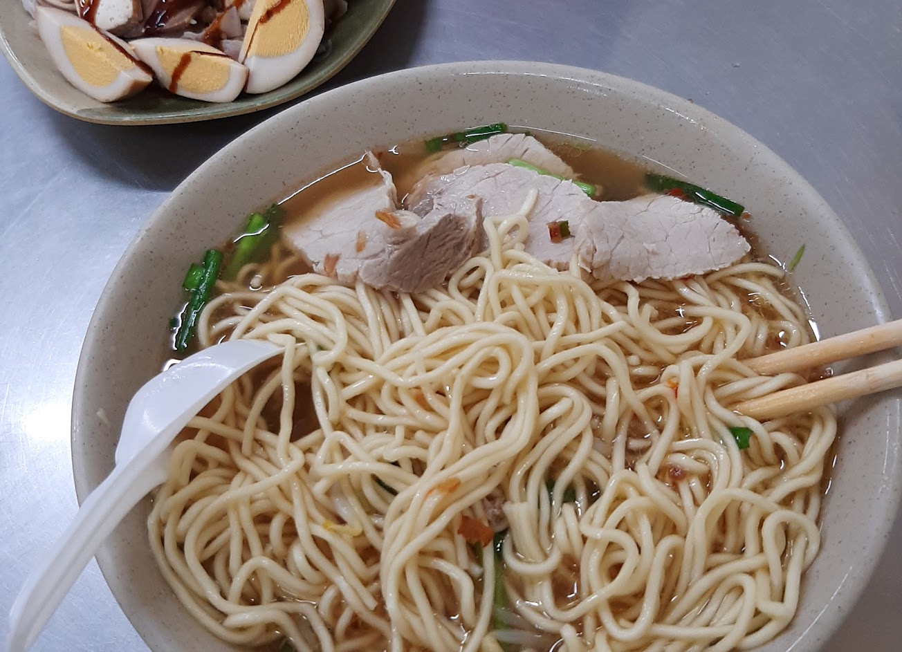 排隊的店,也要耒朝拜一下。 黃麵軟硬適中。乾,湯麵味道鮮,都很好吃,量非常多的足夠。滷菜一般般。 我姐姐說肉片有點乾瘦。我是覺得ok