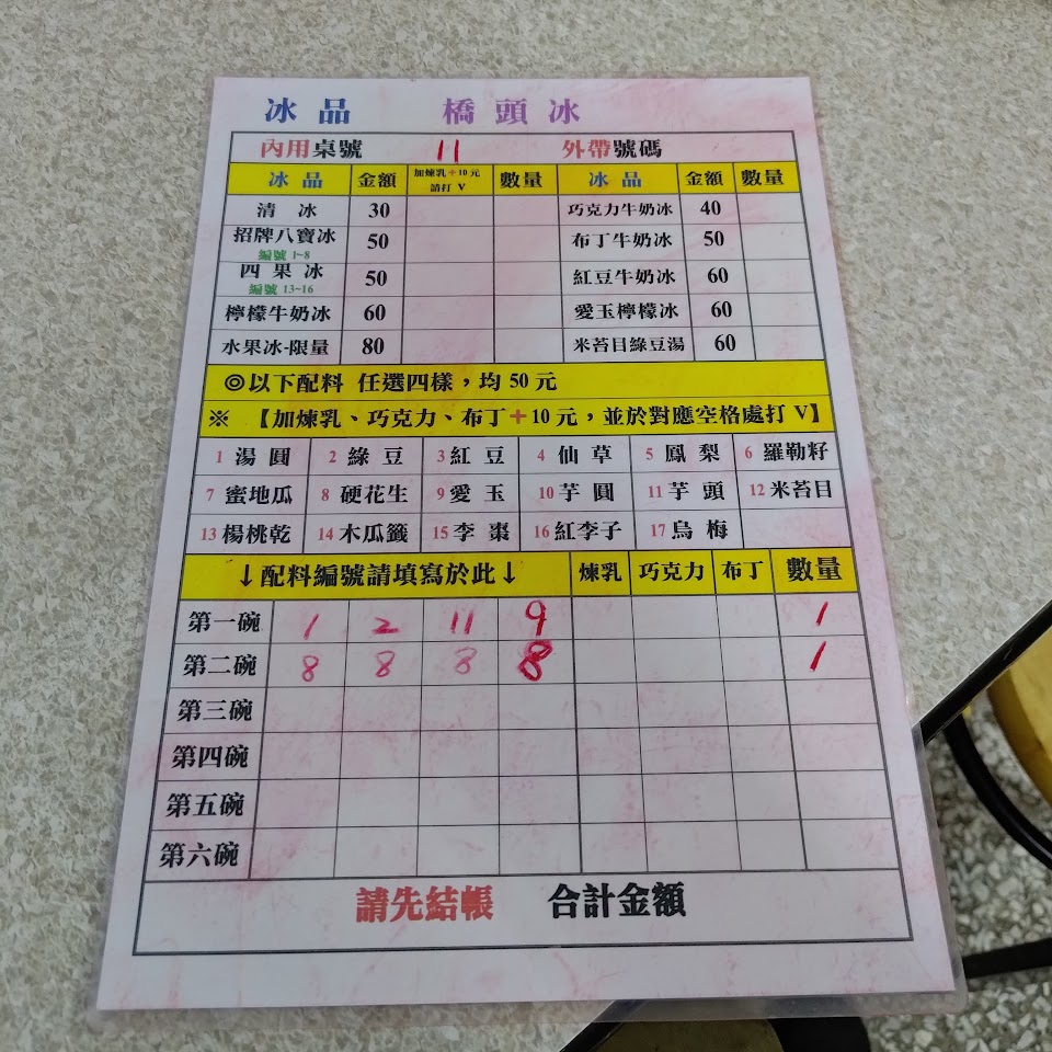 平易近人的價格,老闆服務很好,親切又很客氣,給人很誠懇的感覺。 除了八寶冰,還可以自行任選配料,八寶冰也可加布丁跟煉乳。 覺得店家的點菜單製作的蠻好的,很容易填,填完老闆也會非常謹慎的核對品項,感覺老闆做事很認真。 我自己這碗口感方面布丁、芋圓還好,仙草、米苔目都很不錯,煉乳加很多,煉乳也很好吃。 大熱天吃了這冰真的很消暑,裡面很涼爽還有電視可看,也有洗手間可用,餐廳整體乾淨,給人很舒適的感覺。 下次去玉里一定要點湯圓試試看。