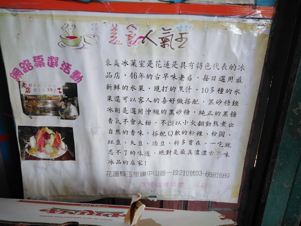 在一個圓環的路邊,幸運的話店門口就有停車位。招牌寫了58年老店,牆面有很多報導的文章和照片,似乎是頗具實力的剉冰冰菓室。因為剉冰料有很多少見的品項,例如:洛神花、金桔、橄欖、桑椹、二種口味竹醃梅(一個是軟口感,一個是硬口感)。我們捨棄了水果冰,改點四種料的傳統剉冰。一盤四十元很實在的價格,最後淋上烏黑濃香的黑糖醬真的太迷人。洛神花酸甜爽口,鳳梨也是。桑椹就偏甜但顆粒果實的口感還在,新鮮自然的一碗冰當做玉里旅行的終站很不錯