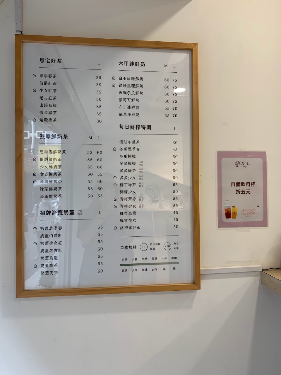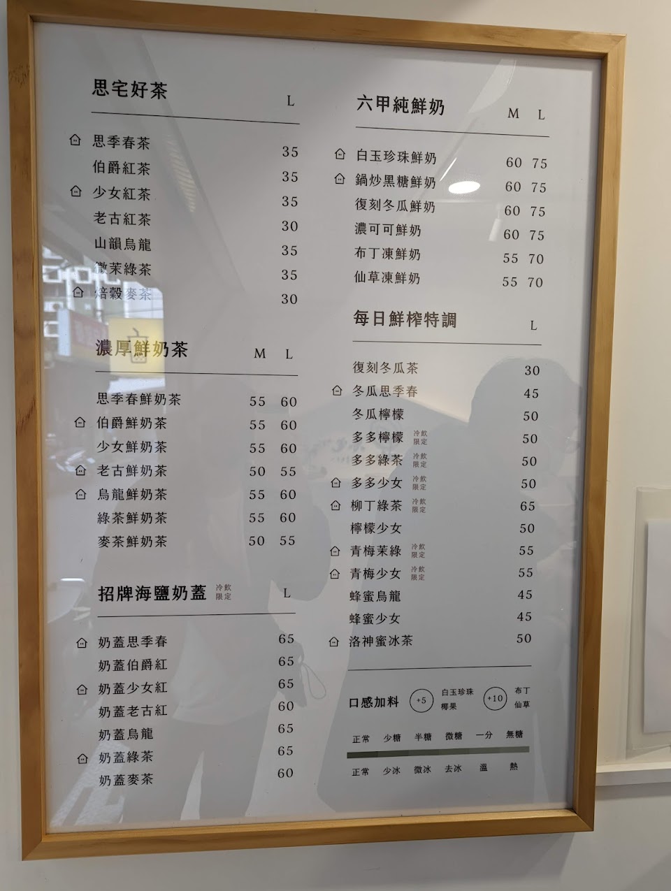 茶類推薦少女紅茶(蜜桃香)、思季春茶,無糖順口不澀,做成鮮奶茶、奶蓋茶(鹹起司)也好喝,白珍珠有嚼勁不軟爛。仙草凍鮮奶:仙草非常滑嫩,一大塊也能用吸管輕易吸起,料非常足能吸到最後一口;濃可可鮮奶:無糖也能喝到濃濃巧克力香,會沈澱喝的時候記得先攪拌;鍋炒黑糖鮮奶:黑糖香甜,想喝甜飲時來一杯很療癒;洛神蜜冰茶:酸甜適中,非常清爽不膩口。現金、linepay、街口支付。