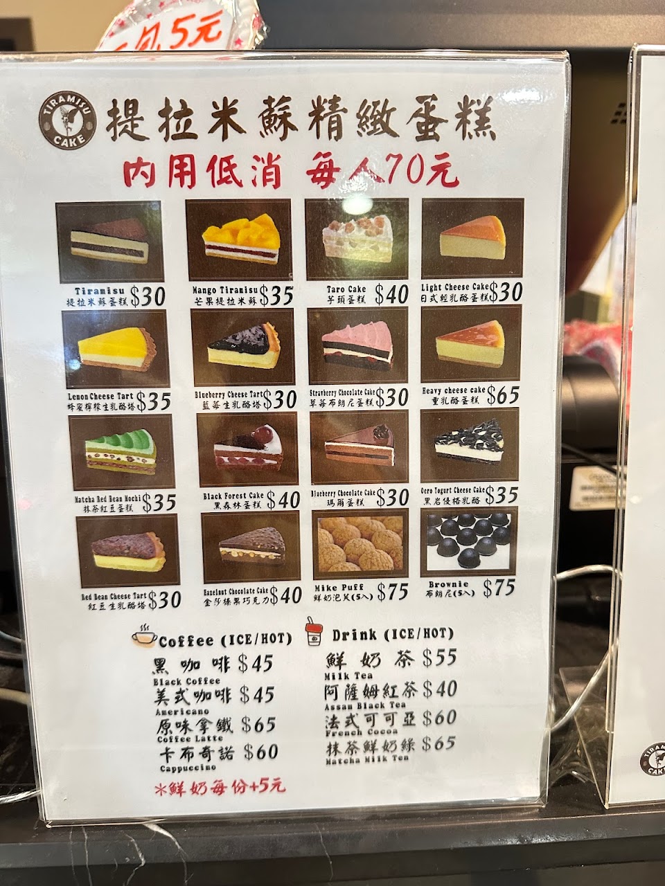 超級爛,建議不要內用,內用低消要70,一塊蛋糕賣不超過70,要人硬要點滿一塊以上,然後提拉米酥是冷凍的,要多久才可以吃?又限制內用低消,什麼爛東西,我一個人帶兩個小孩,點三塊卻不能內用,還給我一塊要等退冰的提拉米蘇,要等幾分鐘以後才可以吃?有腦的規定?