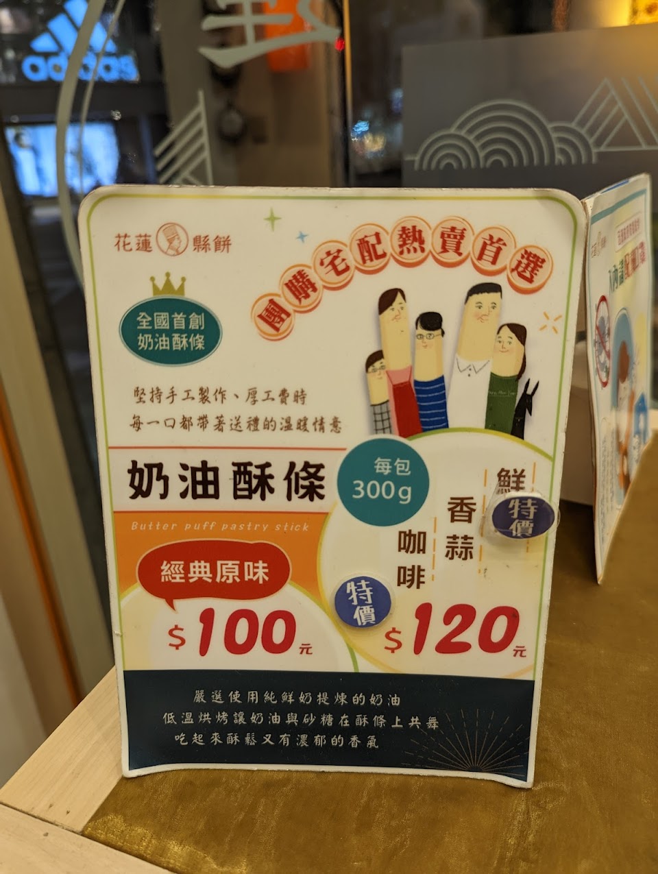 來到花蓮,我就想到每次必買的花蓮縣餅-奶油酥條,這次來到店家看到有其它口味,很興奮的也買了蒜味及咖啡口味。