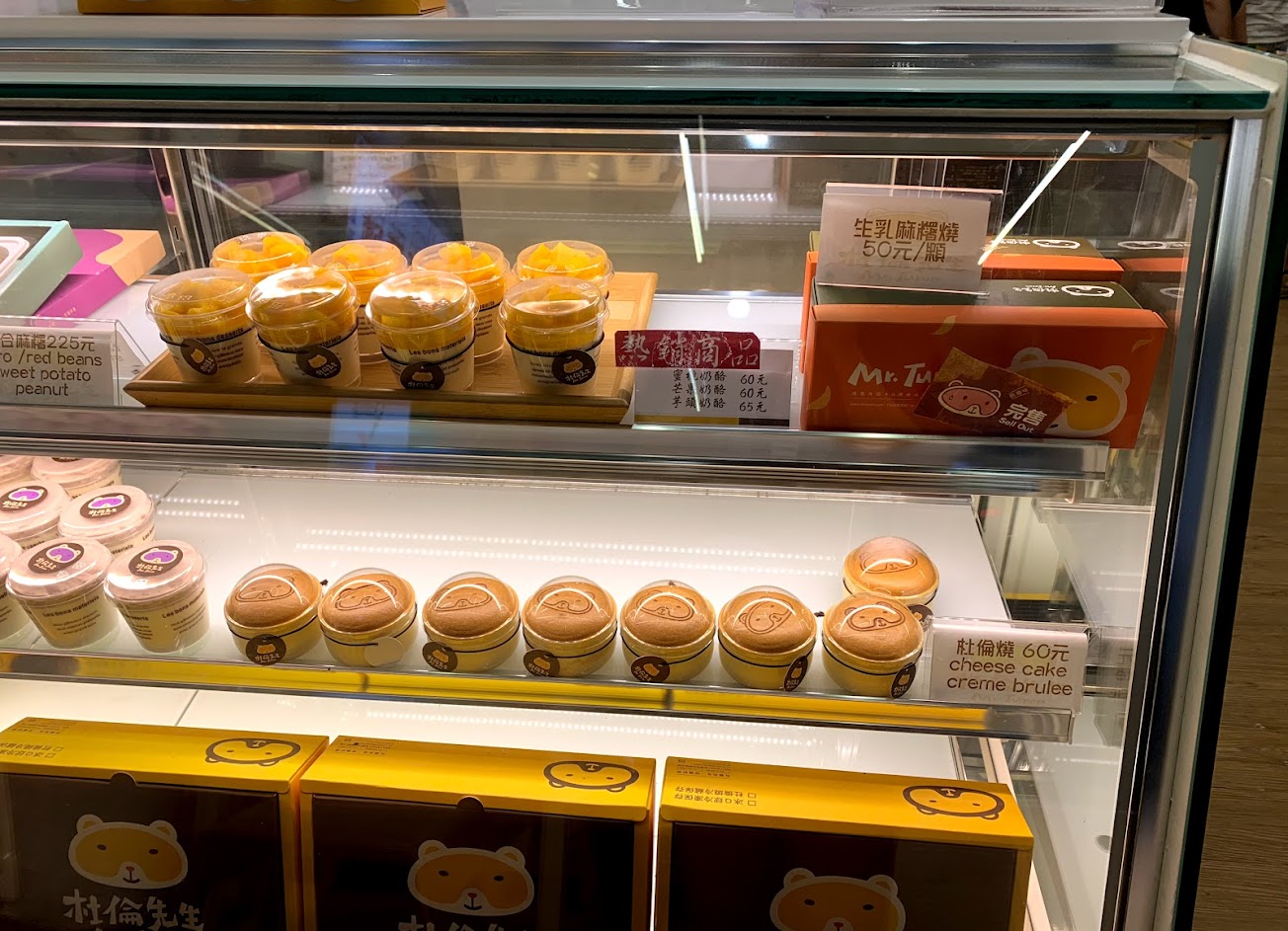 服務人員很親切,會跟我們仔細介紹店內產品,為我們推薦熱門品項,這次為了買禮物送人,同時買份小點心送給自己,推薦冰Q球,我是吃芒果口味,外層的麻糬配上芒果卡士達奶油和蛋糕,口感很有層次,冰過後更好吃,一份$60還可接受。上次有吃過他們的招牌杜倫燒,上層一樣是海綿蛋糕印上他們吉祥物圖樣,下層是布丁,個人是覺得普普。店內杜倫燒、奶酪和冰Q球可以任意搭配湊6個作一盒帶回去,一盒$360,沒有比較便宜,不過有個可愛的盒子可以帶走。