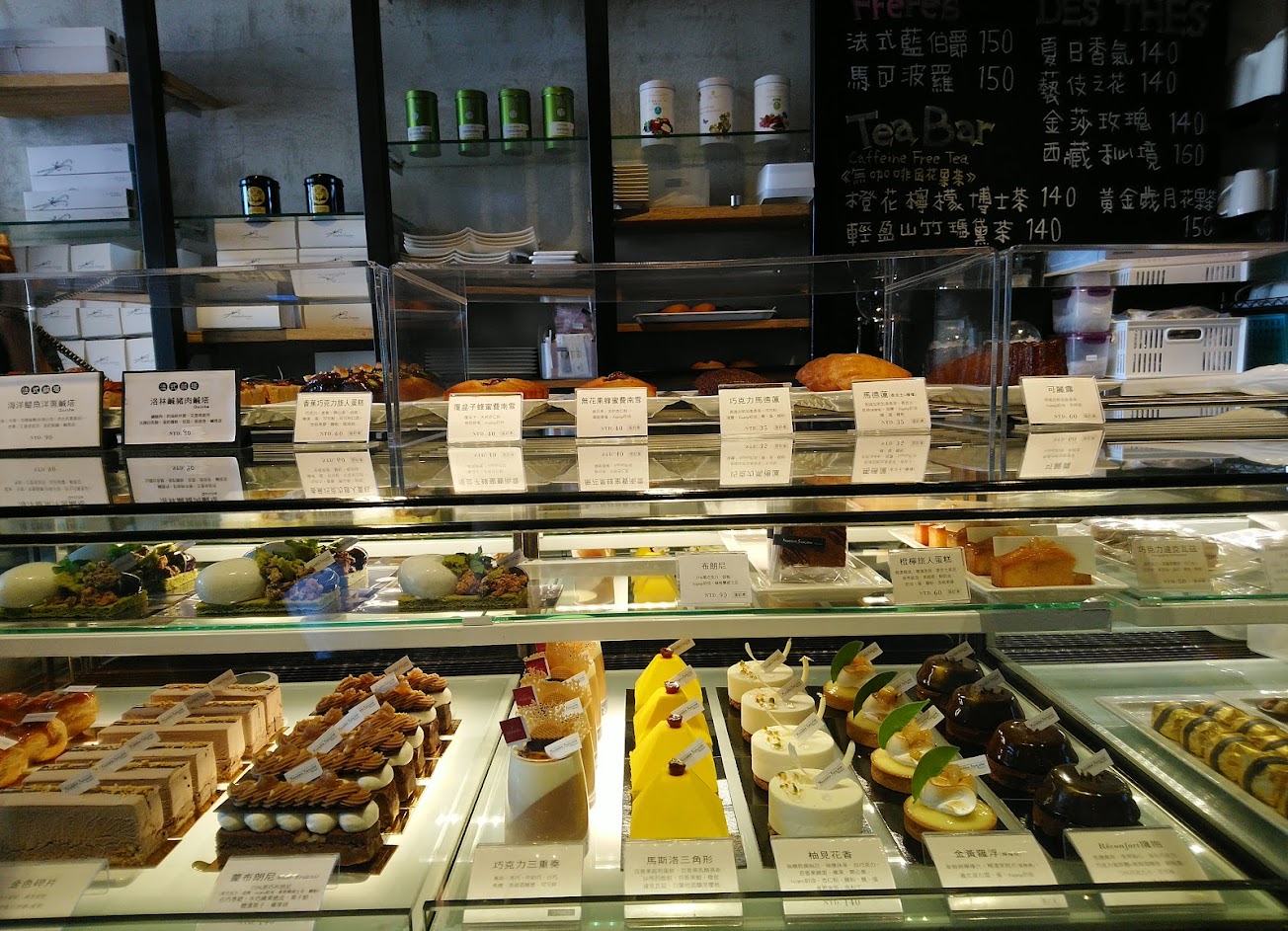 時尚咖啡店,玻璃櫃中有許多精緻的法式糕點與甜點。