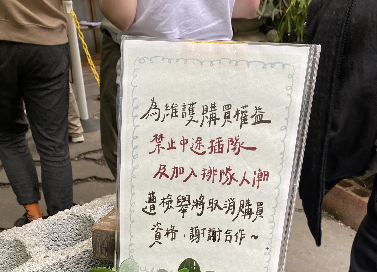 平日1:50pm開始排隊 到結帳完成約莫好時一小 戶外很多小黑蚊 店家有提供防蚊液 巷弄店面真的不易找 店員會先解說每組進六位 嚴格進場實名制 蓋手章勿插隊 免拿號碼牌無限制購買數量
