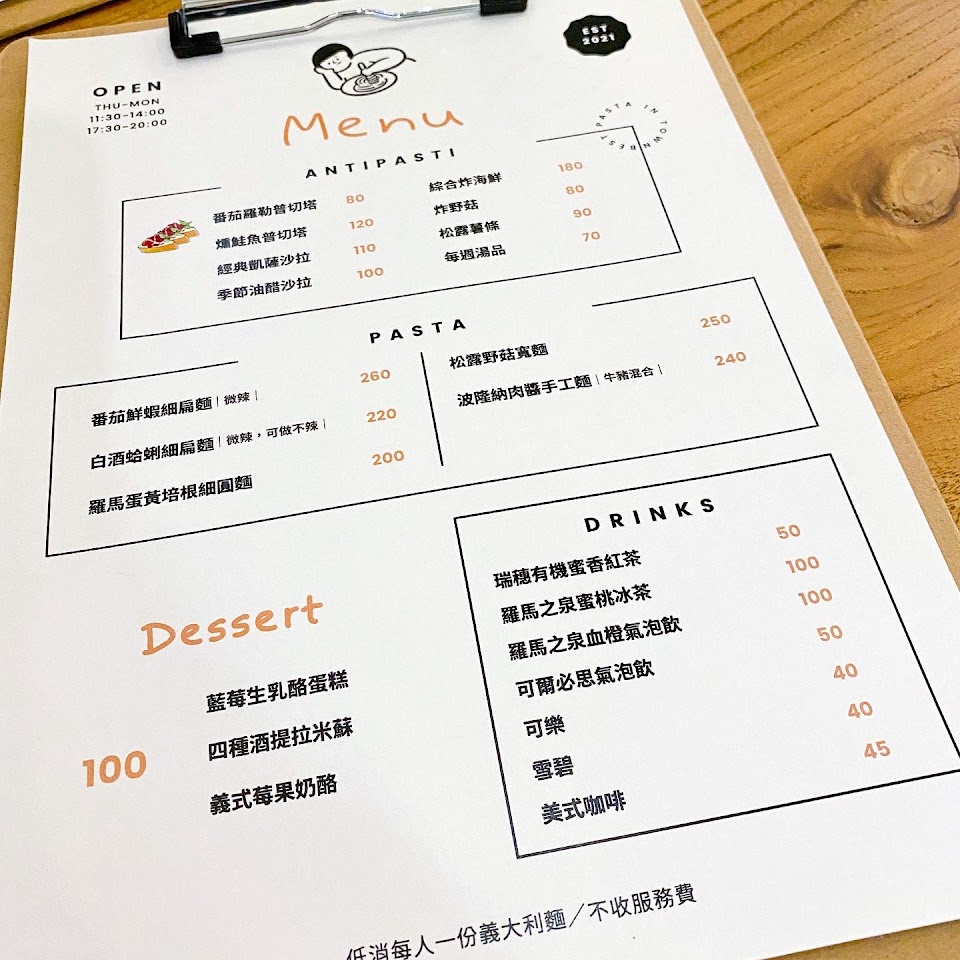 2023/09/18 外觀為老式西裝店很有氛圍、支援現金、台灣pay,義大利麵選項不多,當日選用白酒清炒蛤蜊250元:麵條是有硬度的口感、尾韻帶有橄欖油香味個人很喜歡!鮮蝦義大利麵250元: 醬料鮮味十足,可惜料跟份量偏少,食量大的人可能會吃不飽;整體以CP值來說偏低。