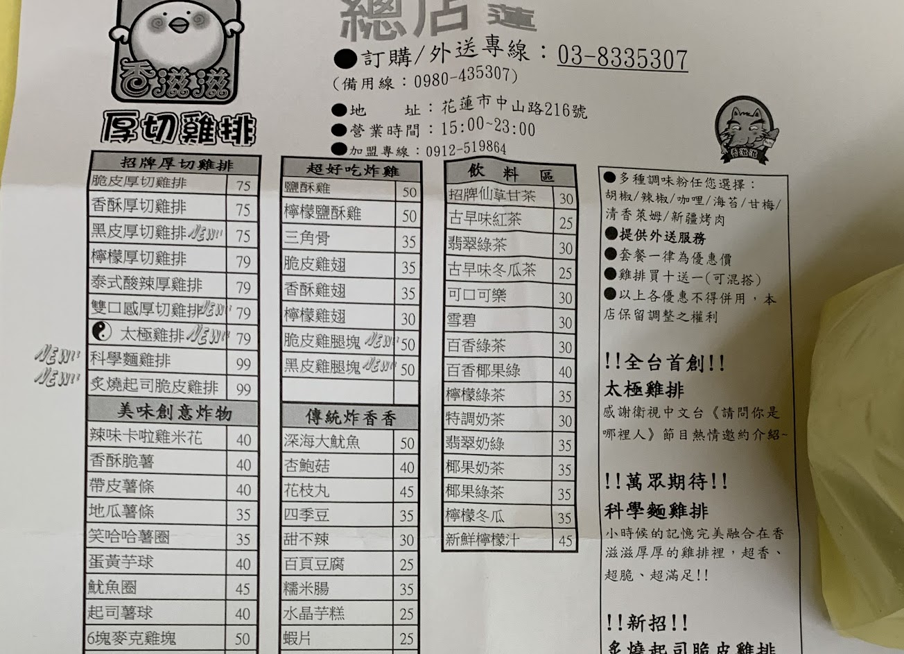 厚片黑皮及太極雞排是特色 服務 外帶 餐點類型 其他