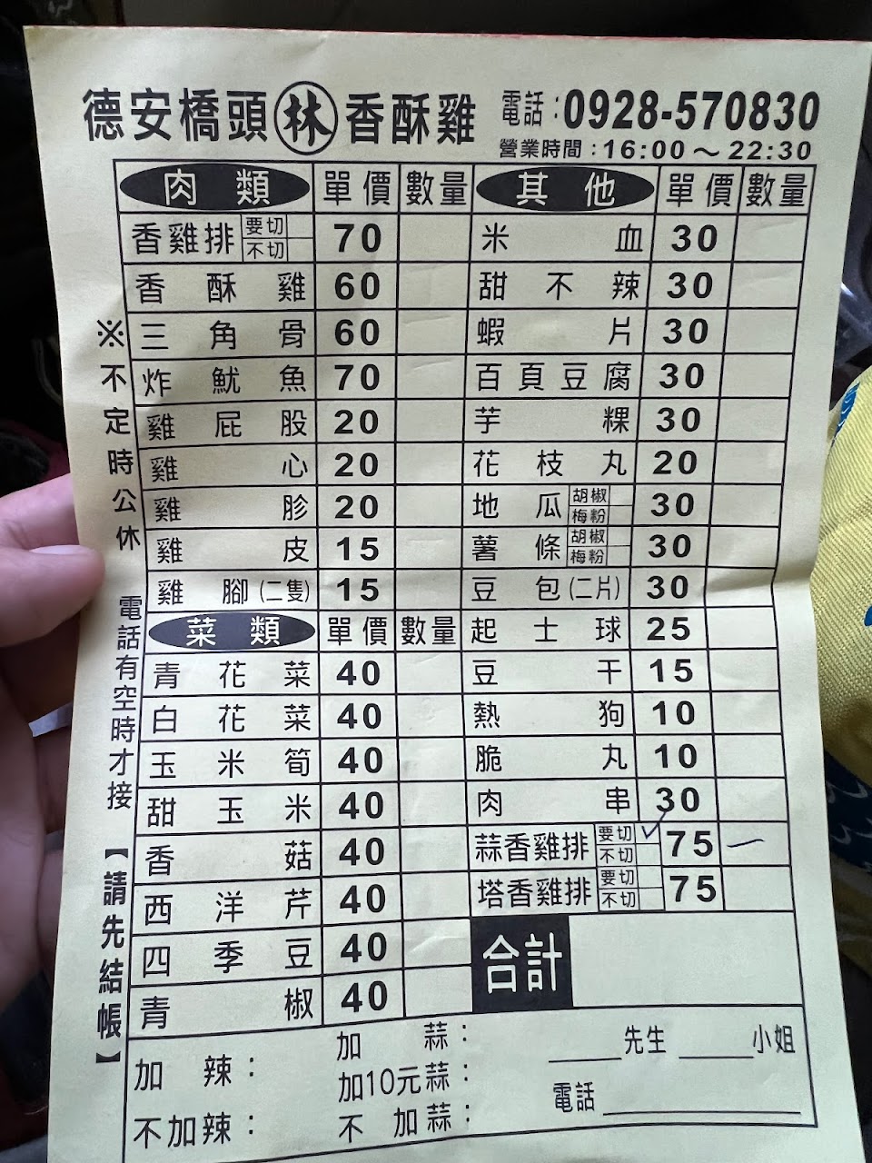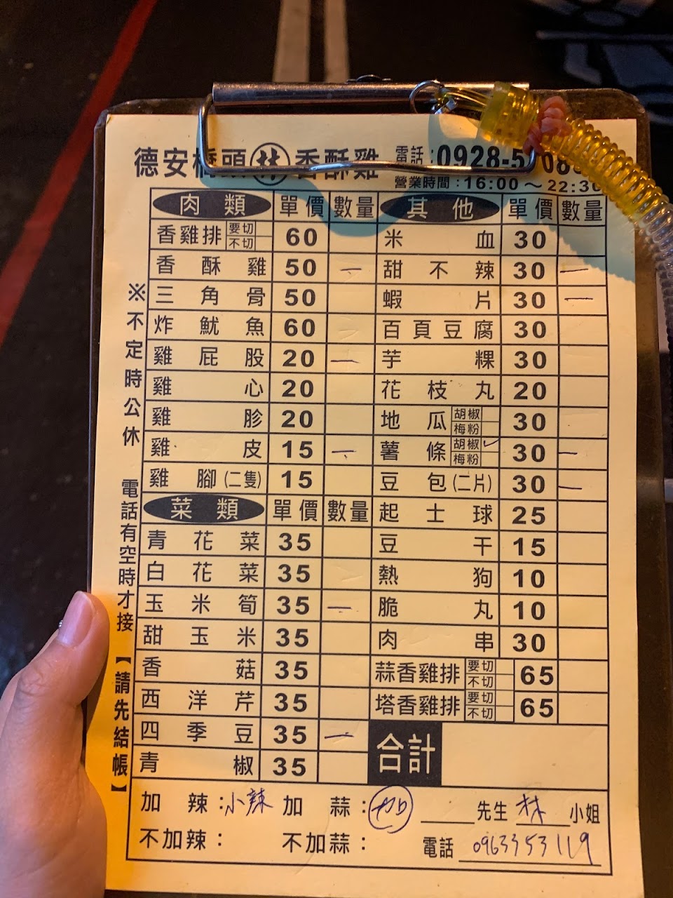 週六下午四點半現場點餐,等大約15分鐘,還滿快的!也可以電話先訂餐(但太忙的時候會關機)