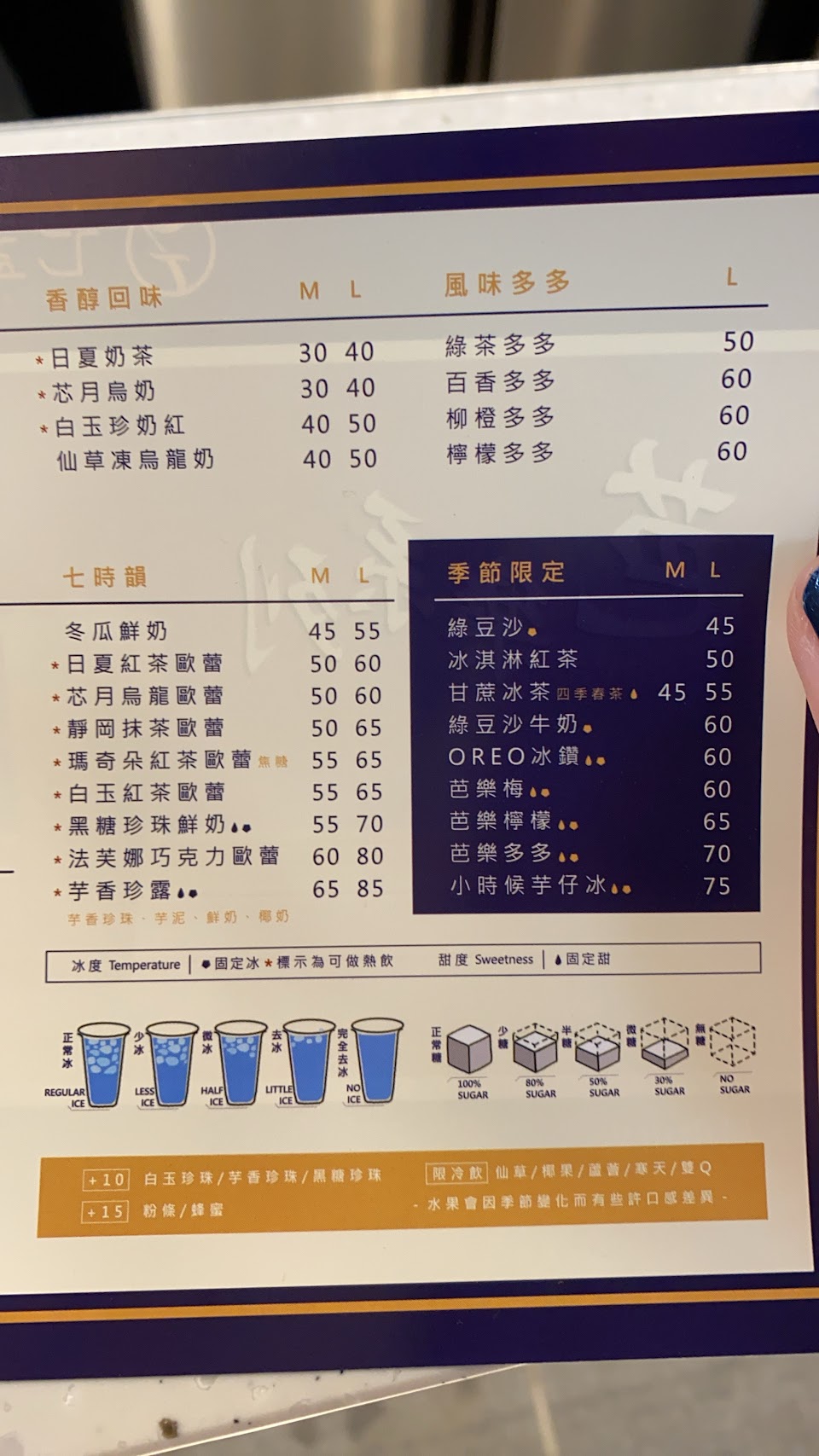夏天推薦白天很熱時喝四季春(少糖完全去冰)或綠豆沙牛奶(少糖),口味重可選碧玉幽蘭。晚上飯後1小時可喝七盞紅萃,口味重可選日夏紅茶。