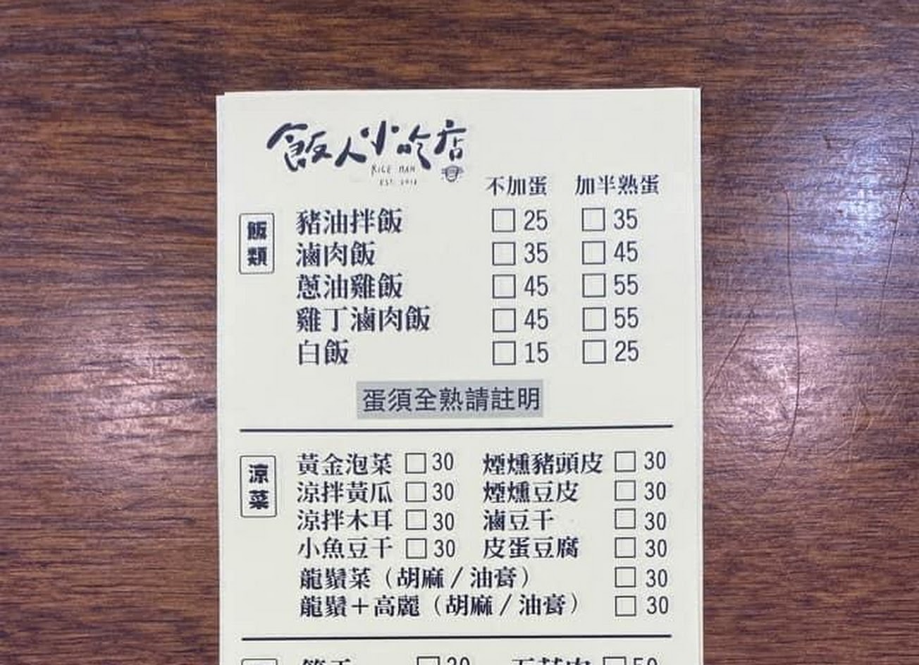 飯人 Rice Man原來是台餐車 這幾年租了一間店面 裝潢走一個簡約文青風 菜單的內容跟餐車時大同小異 主要提供飯類、小菜 ⠀⠀⠀⠀⠀⠀⠀⠀⠀⠀⠀⠀⠀⠀⠀⠀⠀⠀⠀⠀⠀ ⠀⠀⠀⠀⠀⠀⠀⠀⠀⠀⠀⠀⠀⠀⠀⠀⠀⠀⠀⠀⠀ ?️蔥油雞飯 $ 45 雞肉是雞腿肉,油蔥與白飯非常搭 鹹度剛好且有淡淡不嗆鼻的胡椒香 拌著半熟蛋吃很讚 ※圖片是有加點10元半熟蛋 ⠀⠀⠀⠀⠀⠀⠀⠀⠀⠀⠀⠀⠀⠀⠀⠀⠀⠀⠀⠀⠀ ?️魯肉飯 $ 35 魯肉飯是手切肉塊 醬汁不會太油膩且與白飯很融合 ?️貢丸湯 $ 30 味道中規中矩 但30$有三顆大貢丸 個人覺得還不錯? ?️油豆腐 $ 30 一份是四塊的三角油豆腐 ?️小菜皆 $ 30 小菜都放在櫃台自己選 除了基本的小黃瓜、筍干 到煙燻豆包等等都有