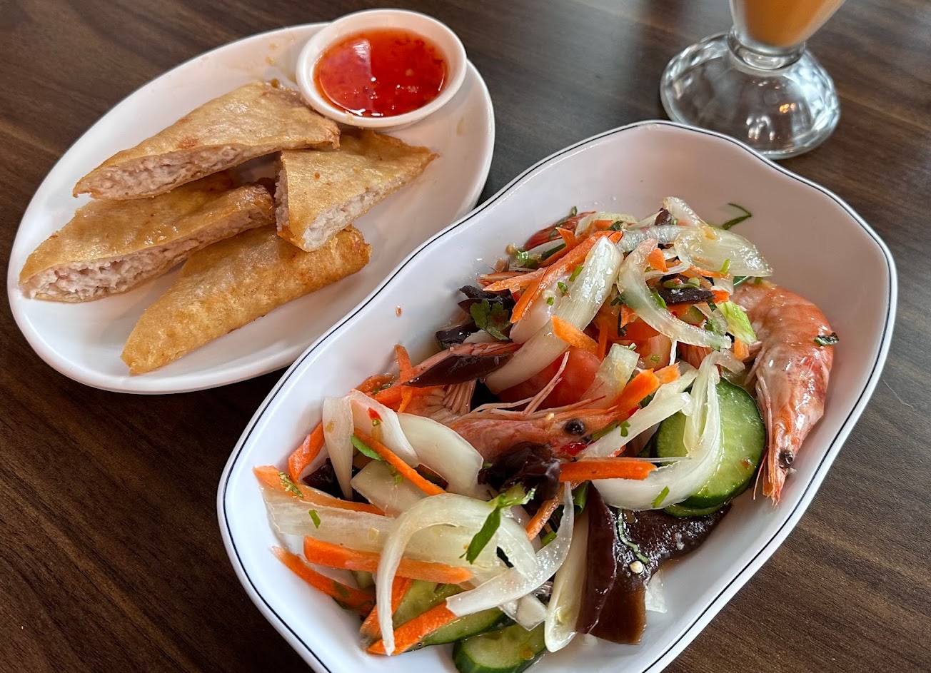 點了[泰式炒粿條(不辣),泰式椒麻雞飯,泰式海鮮涼拌,泰式檸檬豬,泰式奶茶]//炒粿條是有帶點微酸口感,前面吃幾口蠻好吃的,吃到後面覺得有點太油膩了(炒的比較油),比較推它的椒麻雞飯,雞肉炸的蠻剛好的,酥香,肉汁也有鎖住,白飯上面的炒蛋很厲害炒的超香很下飯?,(老闆應該是可以推出炒蛋飯來賣?),只是覺得椒麻雞飯只有幾根小黃瓜絲沒配些青菜,吃到後面也是會有點油膩感,好家在有點涼拌海鮮,狂配裡面的洋蔥來解膩?,涼拌海鮮還蠻好吃,蝦子很新鮮,醬汁也很讚,另一盤泰式檸檬豬的醬汁也很讚,只是豬肉片口感有點乾柴,個人比較不愛,泰式奶茶喝起來偏淡,上菜速度非常快,店內環境很乾淨整潔,服務態度也都非常好,店員叔叔收拾桌子都非常乾凈迅速,辛苦了,,?