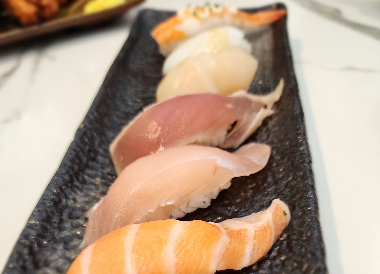 烤比目魚壽司、考鮭魚壽司、炸唐揚雞