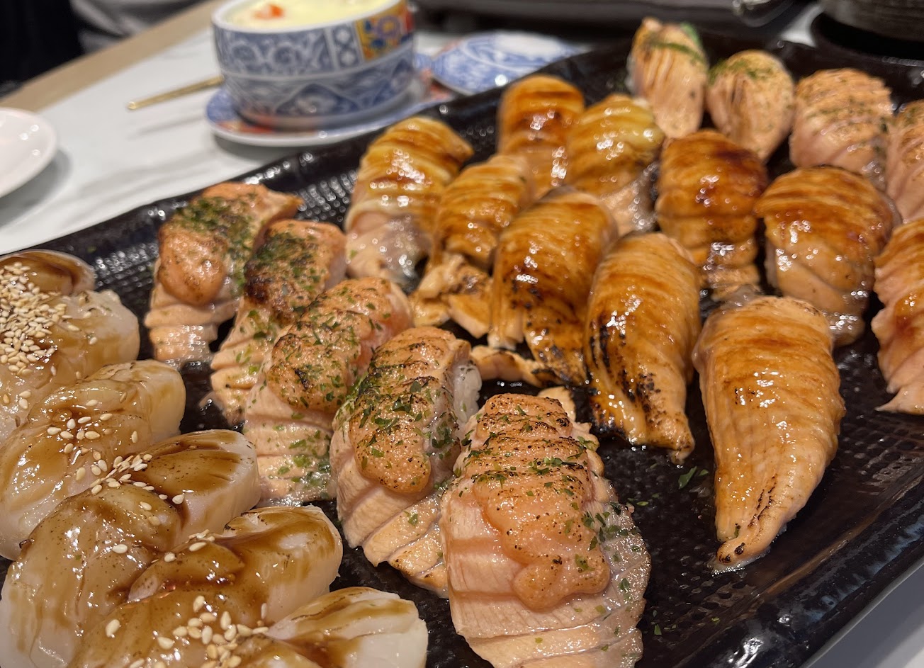 吃過的天使紅蝦都是甘甜的。這邊的蝦殼難剝明顯不新鮮,蝦頭還有一股強烈的腥臭味,讓人反胃,其他食材也不好吃。 炙燒鮭魚壽司,有結塊的脂肪,口感不舒服。