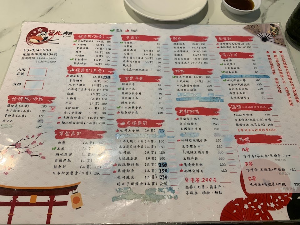 餐點好吃,每次來花蓮必吃,當月壽星打95折還贈送布丁? 服務 內用 餐點類型 晚餐 平均每人消費金額 $400-600 餐點:5 服務:5 氣氛:5 建議的餐點 櫻花壽司 花壽司 豆皮 玉子燒 鮭魚卵壽司 焦糖鮭魚壽司 用金桔片調風味 讚