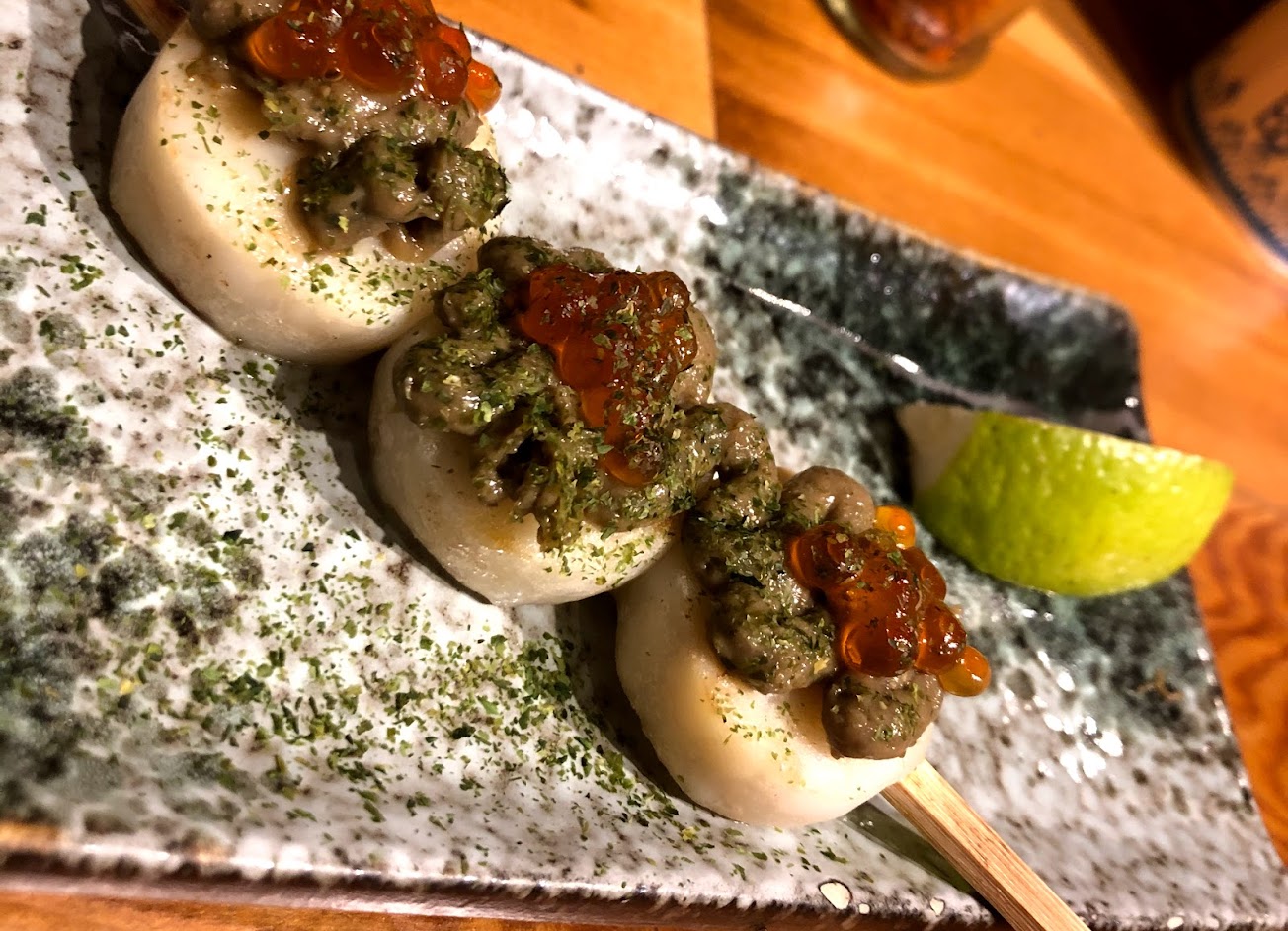 蟹膏干貝串-搭配鮭魚卵好吃,但干貝好像是冷凍的,所以沒有很嫩,吃一串試試味道就好,不用點太多