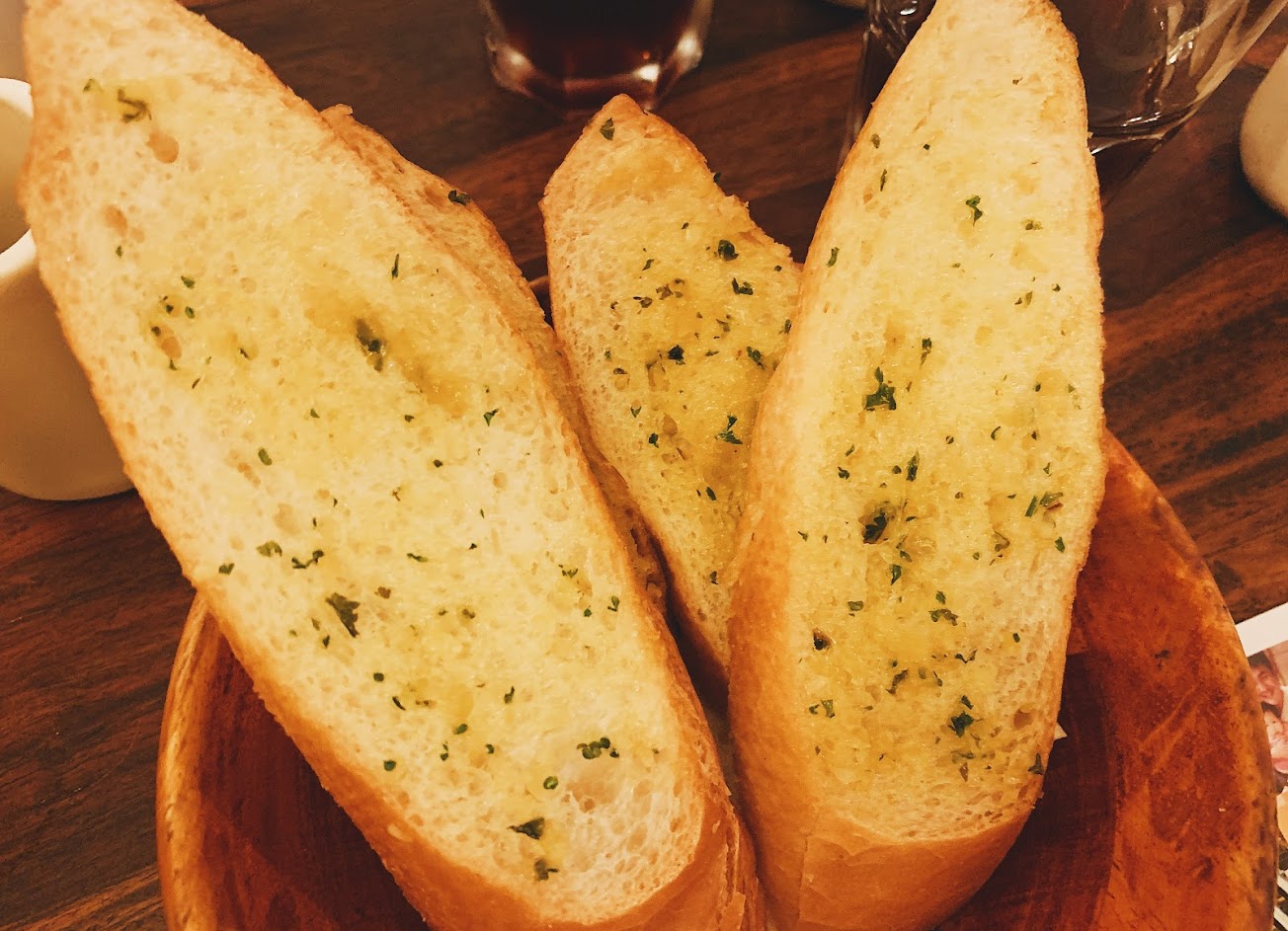 歐香的蒜香麵包,烤過後外圍酥脆,白色麵包部分鬆軟可口,加上蒜香輔佐,讓人多吃一點都覺得不膩。