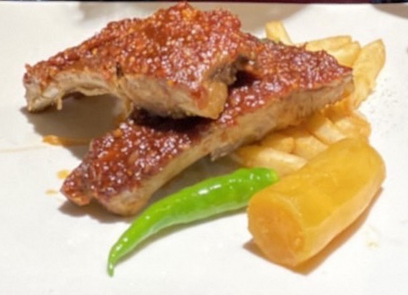 點的餐是“主廚推薦“的豬肋排價格7百多元, 原本以為“主廚推薦“不會踩到雷,但是, 口味差強人意, 首先豬肋排, 應該是有先用迷迭香醃過,但仍吃得出來有豬肉腥味,再來是豬肋排上的淋醬,雖然調製成酸味但醬的基底太甜, 接著是甜椒,表面有油亮, 表示過過油,但卻沒把甜椒過夠熟去讓它帶出自然甜, 所以吃起來是生的,沒有甜椒的自然甜味, 最後, 地瓜,本身已有其自然的甜味卻又去蜜它, 造成甜膩 雖有附熱酸梅茶,酸梅茶也是很甜的, 所有組合起來就是不自然的味道且很甜膩, 整個主餐唯一能吃得完的只有薯條