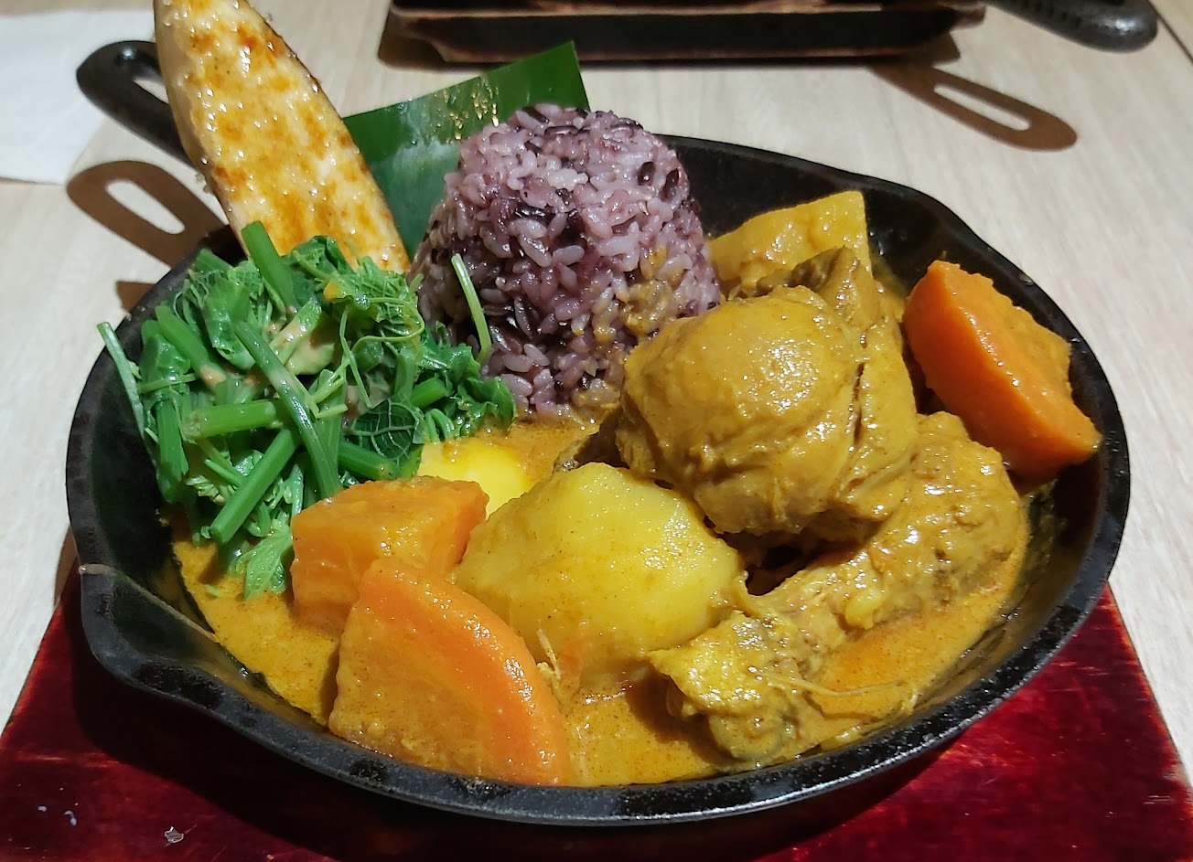 點了椒麻當仁牛咖喱香味濃郁,飯跟咖哩醬都可以續,友人表示烤雞腿本身就過鹹就沒有沾咖喱醬,另外也買了些咖哩醬回去,景觀跟食材都ok,適合IG打卡。