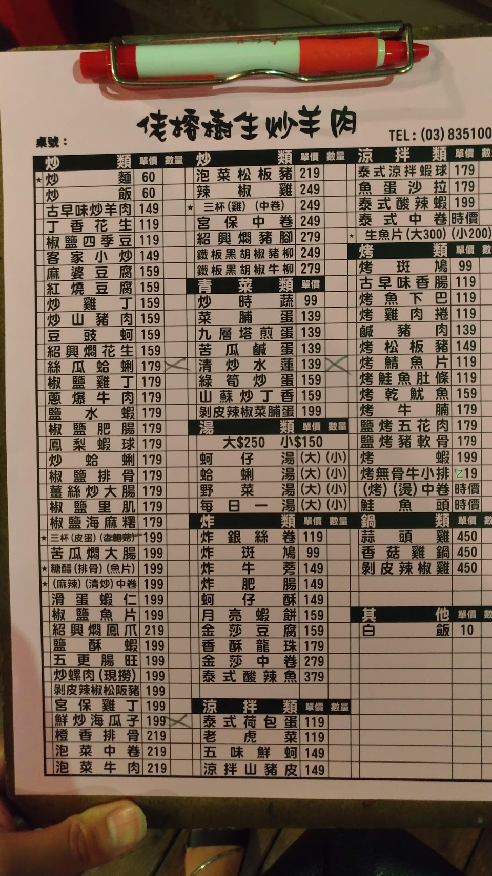 從台北過來,google找到這家,菜色不錯,價錢公道,環境寬敞,服務很好,現流大約2斤多吳郭魚550元,烤的恰恰好,無土味,蠻推~生意很好,多半客人點羊肉爐,這家喜歡,但…炒高麗菜可能是先燙過才炒,整個軟軟的少了靑脆,可惜。。。