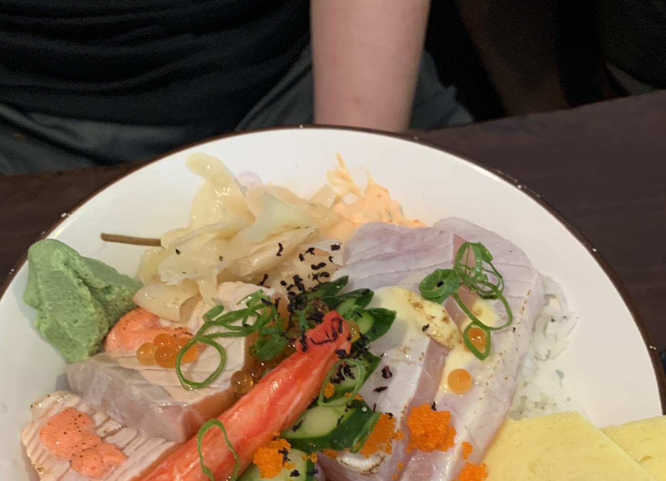 週六晚上生意很好,不過排隊也不會等很久。點了比目魚鰭邊海鮮丼飯跟炸蝦天婦羅,碗真的很大,除了比目魚鰭邊還有鮪魚旗魚跟鮭魚、鮭魚卵還有吻仔魚跟龍蝦沙拉。食材很新鮮,魚肉真的很厚,龍蝦沙拉吃得到很大塊的龍蝦肉。初訪的我沒經驗不知道份量這麼大所以真的點太多,兩道菜都沒吃完?