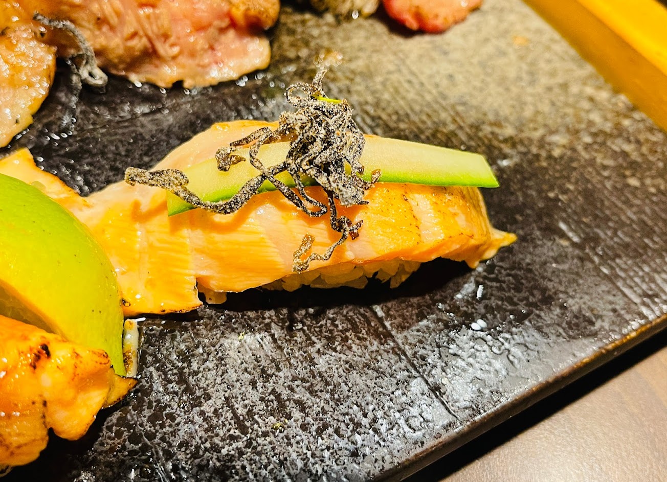 因客人較多,影響到上菜速度,為了不讓客人久等特意招待了一貫鮭魚壽司?