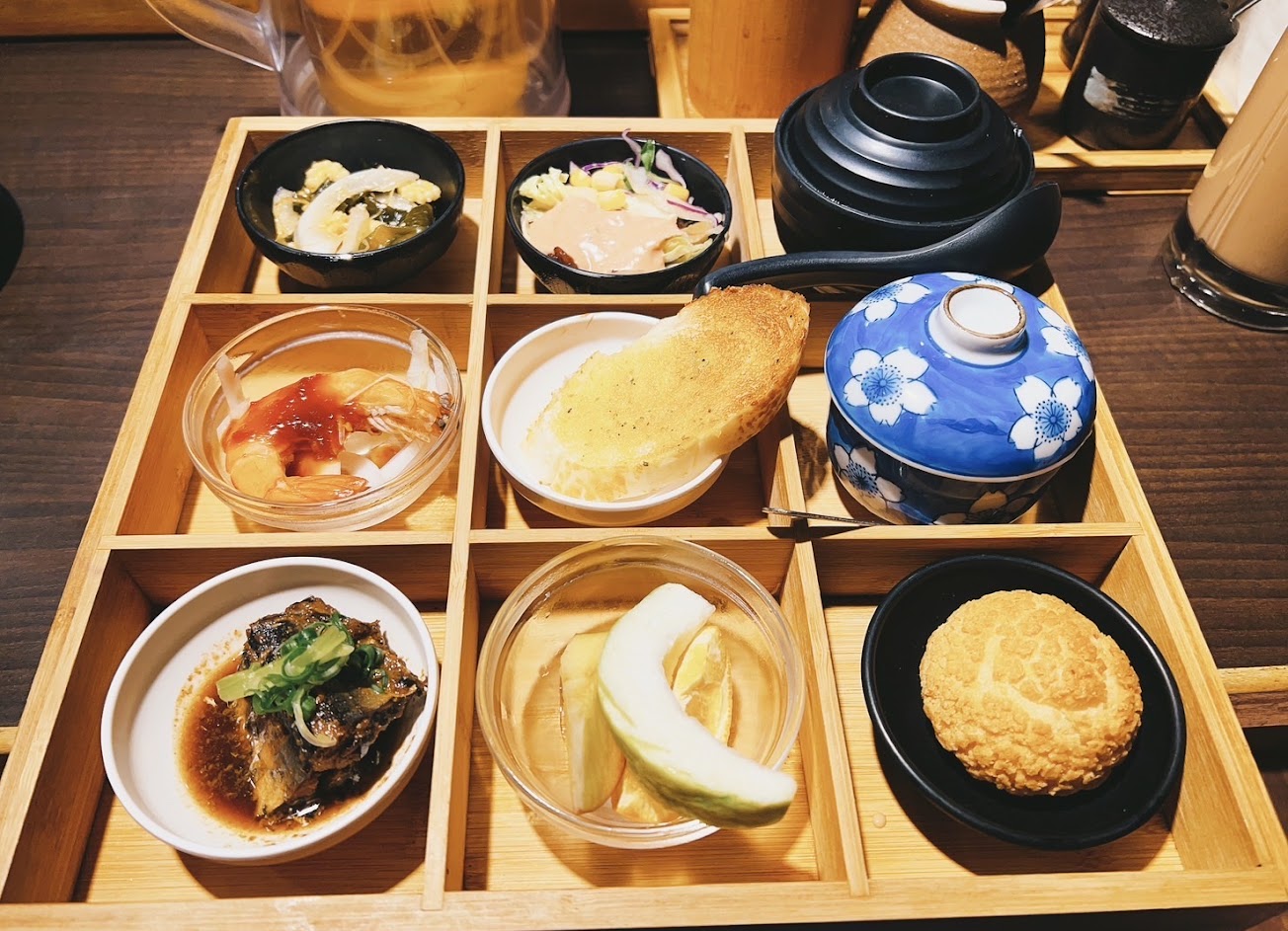 炸軟殼蟹不錯吃,海鮮炒烏龍個人覺得有點鹹,鮭魚親子丼雖然配菜很多,但是飯小小一碗不夠吃,