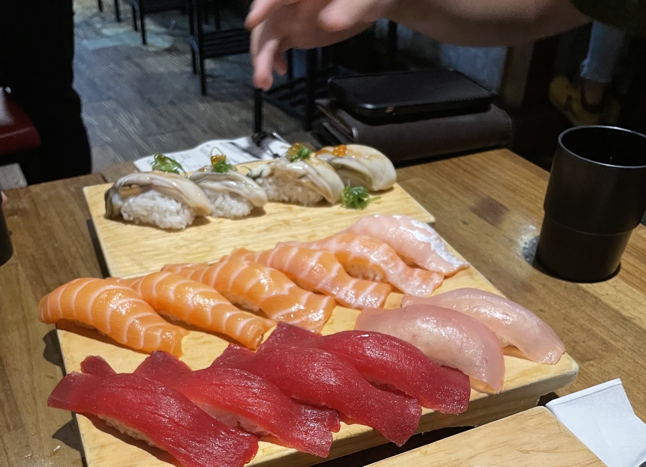 握壽司-鹽昆布安格斯牛很軟嫩。紅酒安格斯牛是上面有一塊紅酒凍,個人不是很愛。比目魚鰭邊入口即化。焦糖鮭魚還不錯。紫蘇梅鮭魚普通。