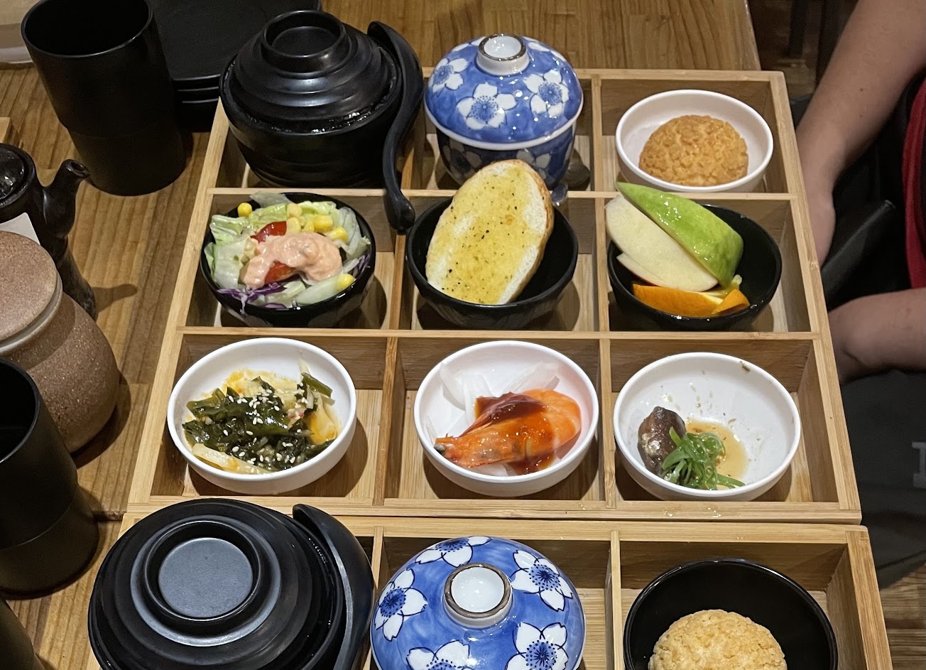 九宮格盤沒有一道的味道是好的,蒜味麵包(應該是)沒蒜味麵包又乾不酥不香,水果放到也是乾的,沙拉的菜葉黃掉然後走水也走不夠菜都發苦,尤其其中的五味蝦,蝦子是帶殼的,結果醬直接淋在上面,剝蝦殼沾的滿手都是。