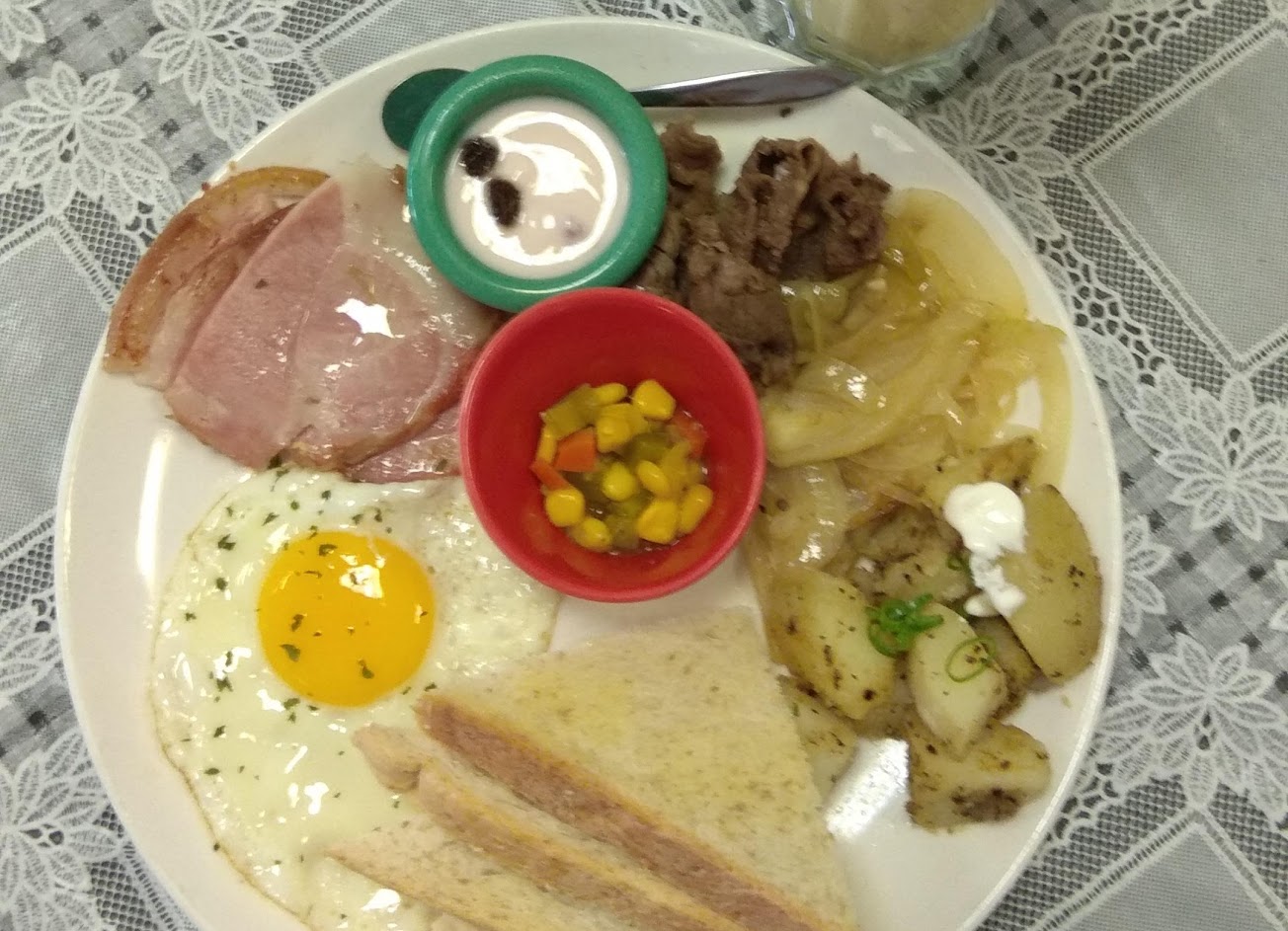 這次點的是兩份國王早餐和一份英式早餐,都點大份量。國王早餐裡面有麵包、兩顆蛋、兩樣肉、馬鈴薯、玉米拌芹菜(?)、菇菇拌洋蔥、優格和飲料;英式早餐內容物差不多,但只能選一樣肉,可能是因為有起司番茄的關係。