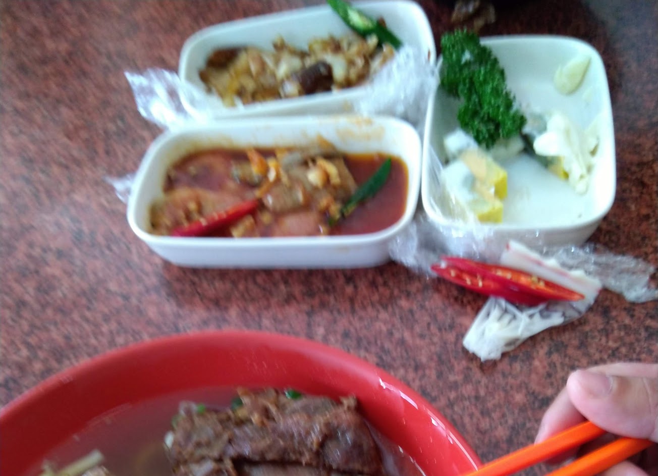 驚艷的口味,牛骨牛肉麵的湯,口味更接近清燉,有濃郁蒜味,牛油味重.2塊左右的牛骨肉就是看運氣囉!有些會柴些.旁邊的豆乳豆瓣醬,辣油醬當沾料真是神搭啊~~老闆還有密製的天辣辣椒醬,愛吃辣的,不要放過.