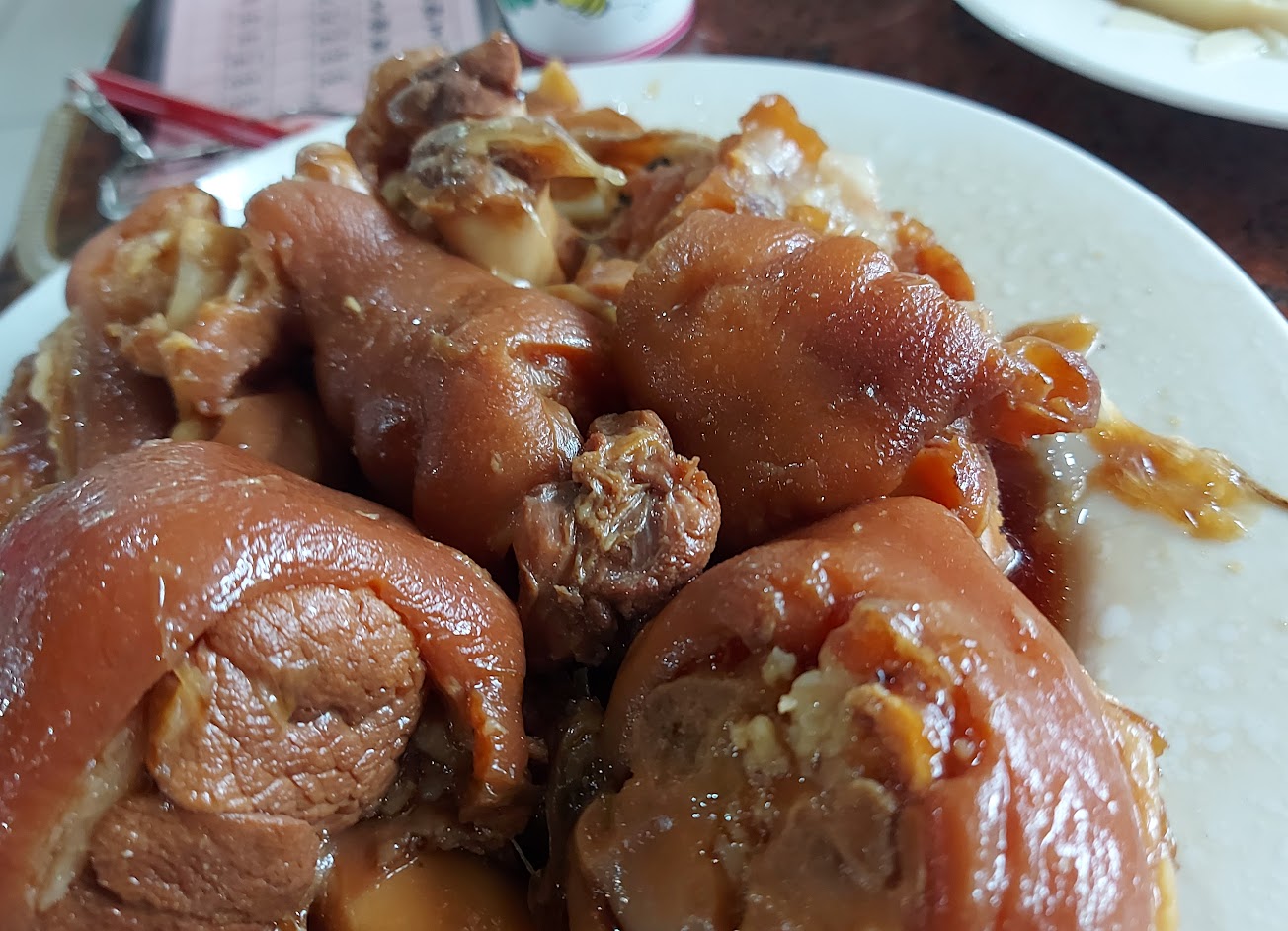 不適合人少時前往,豬腳小份的一整份$400,沒有零售單塊豬腳。品嘗後,豬皮很有Q度而略偏硬,有加蒜粒一起滷。當天下午買回去吃時覺得沒什麼鹹度,吃起來很平淡;前一回家人買來吃時則覺得太過乾鹹,或許是那時調味時手滑了?或者這次滷的時間不夠?