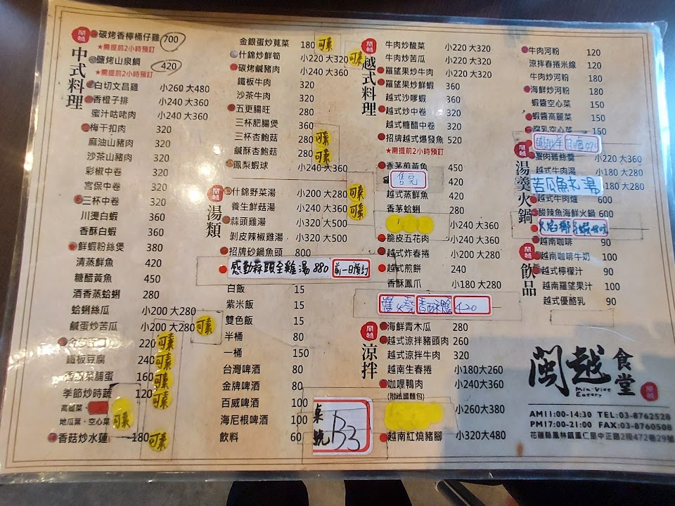 用餐環境寬敞,用餐時間人很多,我們是接近休息時間去,點了閩越白斬雞,炒牛肉河粉,燙白蝦,香菇炒水蓮,味道都不錯,只是我們要求加辣,很可惜不是生辣椒下炒,比較像是辣椒醬伴炒所以偏鹹,白斬雞配的醬料很特別,白蝦非常鮮甜,另外甕窯雞和鹽烤鯛需預定所以沒吃到,但整體來說還可以,還有白飯和紫米可選擇,火鍋類應該也不錯,有經過可以來嚐嚐,價位算中價位不平價,味道偏越式風味酸甜,停車方便若來花蓮玩,值得嚐鮮喔~