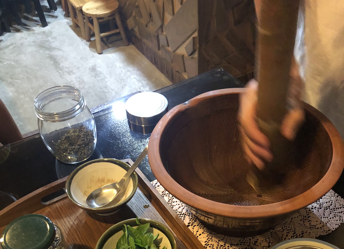 真正的擂茶在這裡,顛覆一般人所看到、喝到的,老闆會為客人一一介紹及製作,也會讓客人體驗。這間餐廳是無菜單料理,所以老闆會依當天食材作料理,也需要事先預約哦!剛好前組客人延遲時間太久,所以老闆娘取消了他們的預約,才能讓我們吃到這麼特別的美食,是值得來品嚐的餐廳!!