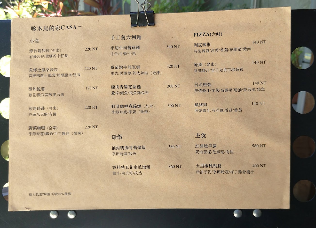 啄木鳥的家藏身在一整片的日式木造建築中,環境清幽令人放鬆,餐點水平也相當高,價位也並未特別昂貴,店員相當耐心親切,也不收服務費;特別推薦鹹豬肉青醬義大利麵和甘蔗披薩,都是別處少見的美食!以鹹豬肉取代一般使用的培根,更具原民風味且比培根更優;甘蔗披薩會加入季節水果與甘蔗膏,甜而不膩,第一次吃到有芭樂的披薩!
