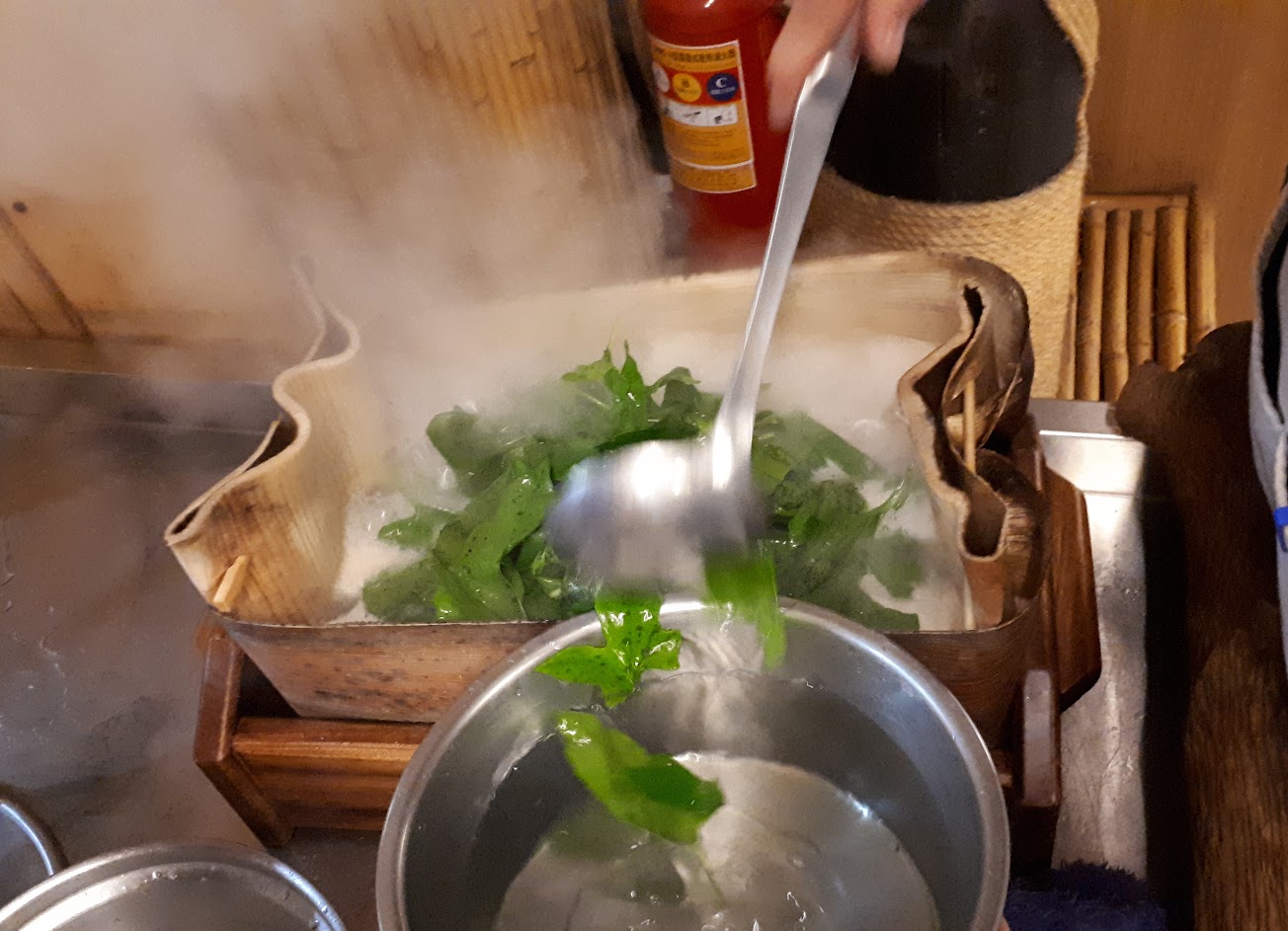 石頭火鍋有特色,是用高溫石頭放入湯中,而鍋子是用檳榔葉做的,湯內有吳郭魚含蝦子。野菜沙拉可以吃到很多在平地吃不到的蔬菜,算是很美味。鹹豬肉也不錯。因為我們是四大一小,所以以上的份量算是很足夠了。