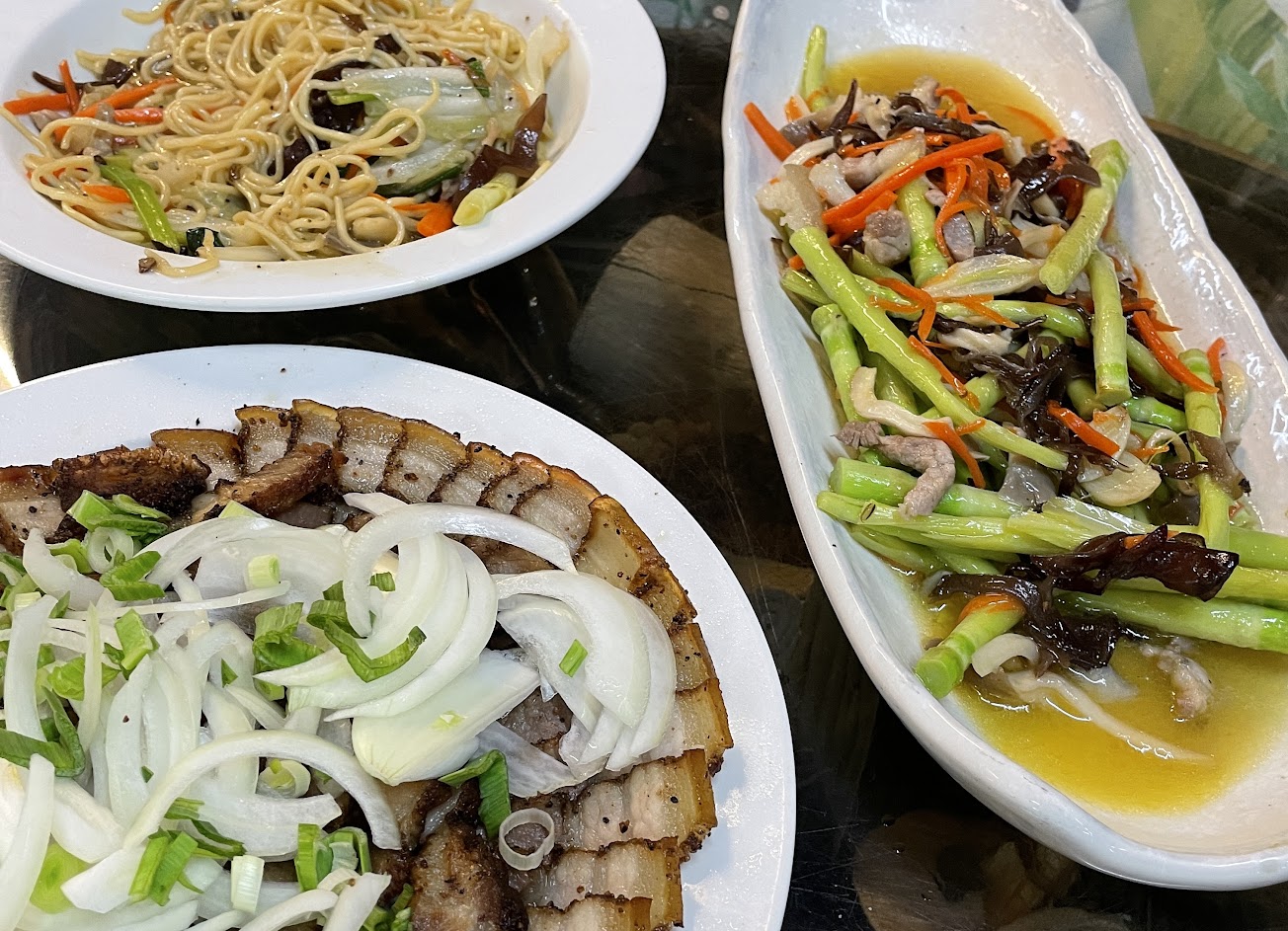 價格親民,菜的份量頗大,兩大兩小點了一隻魚、烤鹹豬肉、牧草心、炒麵,老闆娘就一直提醒我們會吃不完。魚新鮮好吃沒土味。