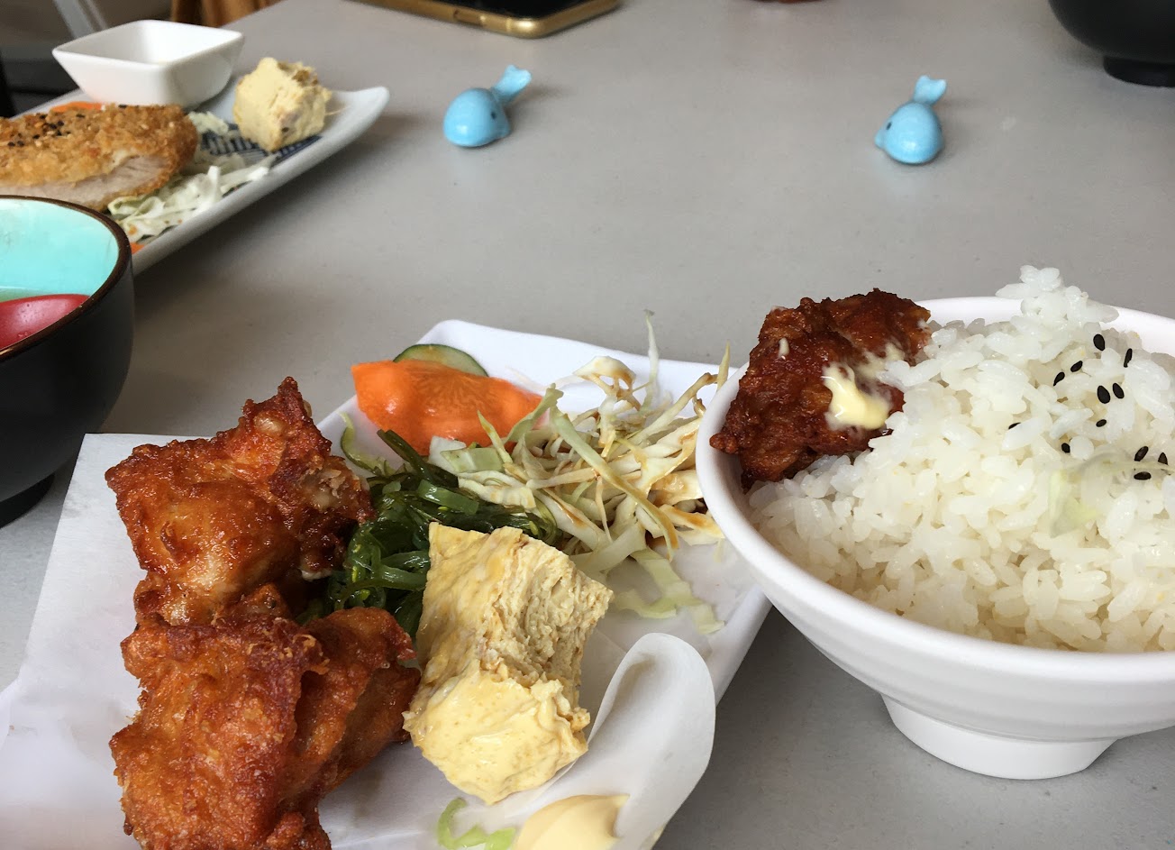 我們點了雞塊跟雞腿排的套餐,本店是日式餐廳所以套餐送來時就像日本定食一樣,雞塊是日本唐揚雞鮮嫩多汁不沾醬直接吃就夠了,味曾湯就有台式風格不鹹味道剛剛好,一定要講一下飯不是一般外面餐廳弄得爛爛糊糊的而是粒粒分明吃起來QQ非常棒!!很想要再多吃個一碗。